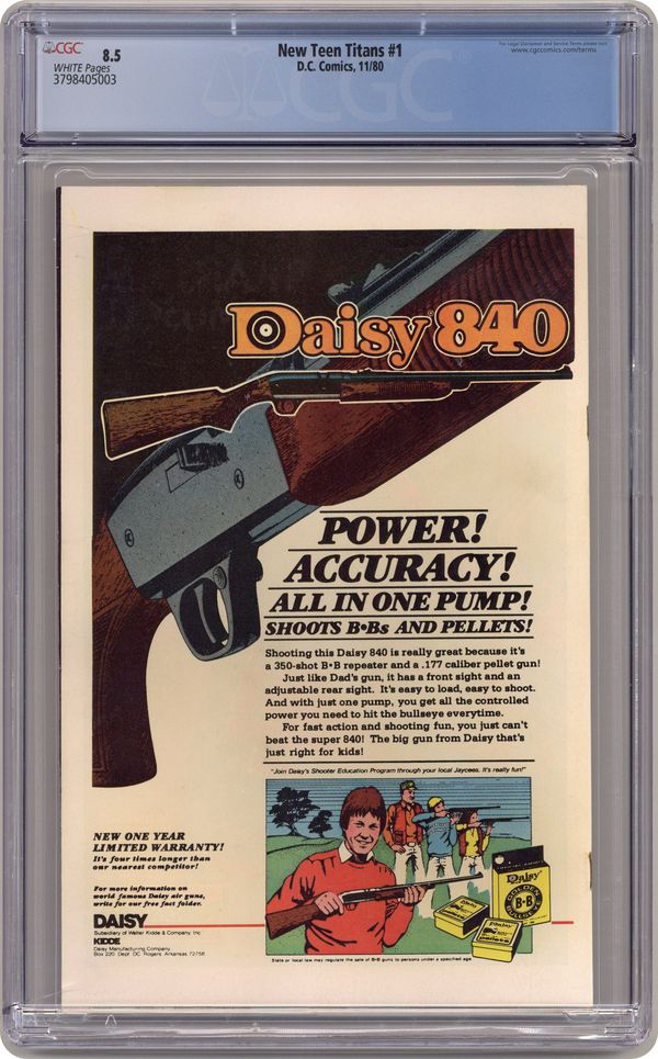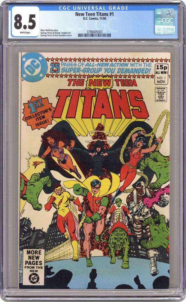 Ended Oct 3 2023 Winning Bid $26 Direct Edition. The mysterious Raven tries to convince Robin, Wonder Girl, Kid Flash, Changeling, Cyborg & Starfire to form a new Teen Titans team in "The New Teen Titans." Cameos by Bruce Wayne and Grant Wilson. Script by Marv Wolfman, pencils by George Perez, finishes by Romeo Tanghal. Cover by Perez & Dick Giordano. Cover price $0.50. Grade: CGC 8.5 explanation of grade Condition: Used (collectible)