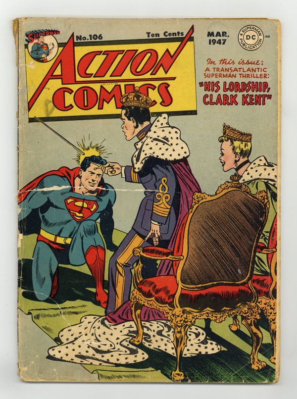Cover art by Wayne Boring and Stan Kaye. His Lordship, Clark Kent! starring Superman, art by John Sikela. Pirate Seas! starring Congo Bill, script by George Kashdan, art by Fred Ray. Doctor of Danger! starring Zatara, script by Joe Samachson, art by W. F. White. Snowed Out! starring Hayfoot Henry, script by Al Schwartz, art by Stan Kaye. Penthouse Pirates! starring Vigilante, art by George Roussos. Tootsie Roll ad starring Captain Tootsie, art by C. C. Beck. 52 Pages, Full Color. $.10 Cover price $0.10. Grade: FR/GD 1.5 explanation of grade Condition: Used (collectible)