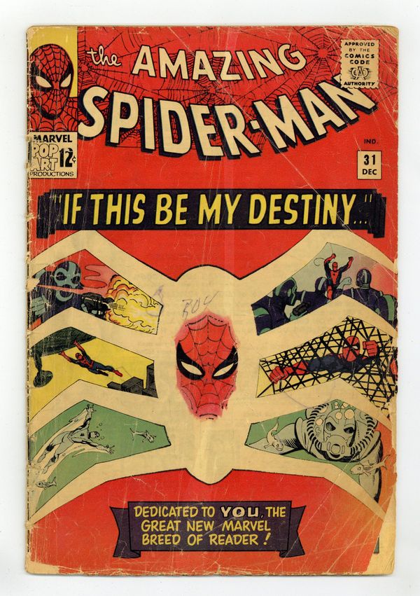 Cover by Steve Ditko. First appearances of Gwen Stacy, Harry Osborn, and Professor Warren. First appearance of the Master Planner (revealed in issue 32 to be Doctor Octopus) in "If This Be My Destiny, script by Steve Ditko (plot) and Stan Lee (script), art by Steve Ditko; Aunt May falls deathly ill on Peter's first day of college. Meanwhile, the Master Planner is stealing scientific gadgets. Marvel Bullpen Bulletins, art by Steve Ditko and Marie Severin; Bullpen Bulletins page discussing staff; Marvel Checklist; ads for Spider-Man T-Shirt and MMMS. Letter to the editor from comics writer Don McGregor. Reprinted in Marvel Tales # 24 and 170. 36 pgs., full color. $0.12. Cover price $0.12. Grade: FR 1.0 explanation of grade Condition: Used (collectible)