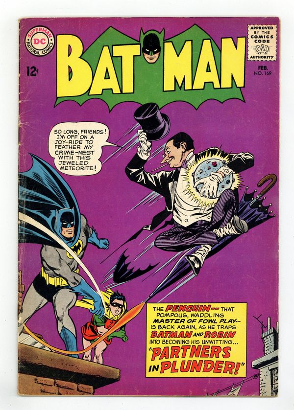 Cover pencils by Carmine Infantino, inks by Joe Giella. Don't Give Fire a Place to Start! public service announcement, script by Jack Schiff, art by Win Mortimer. "Partners in Plunder!", script by France Herron, pencils by Sheldon Moldoff (as Bob Kane), inks by Joe Giella; The Penguin uses an umbrella barrage to trick Batman into planning his next crime for him. "A Bad Day for Batman!", script by France Herron, pencils by Sheldon Moldoff (as Bob Kane), inks by Sid Greene; Batman tells the press about his bad day, in which he returns to the scene of a previous case to retrieve some rope, and spots a jewel thief; He pursues, but a series of bad breaks allows the felon to escape. Fingerprint Facts non-fiction page, script by Julius Schwartz, pencils by Morris Waldinger, inks by Tom Nicolosi. Letter to the editor from comics writer Mike Friedrich. 36 Pages, Full Color. Cover price $0.12. Grade: GD+ 2.5 explanation of grade Condition: Used (collectible)