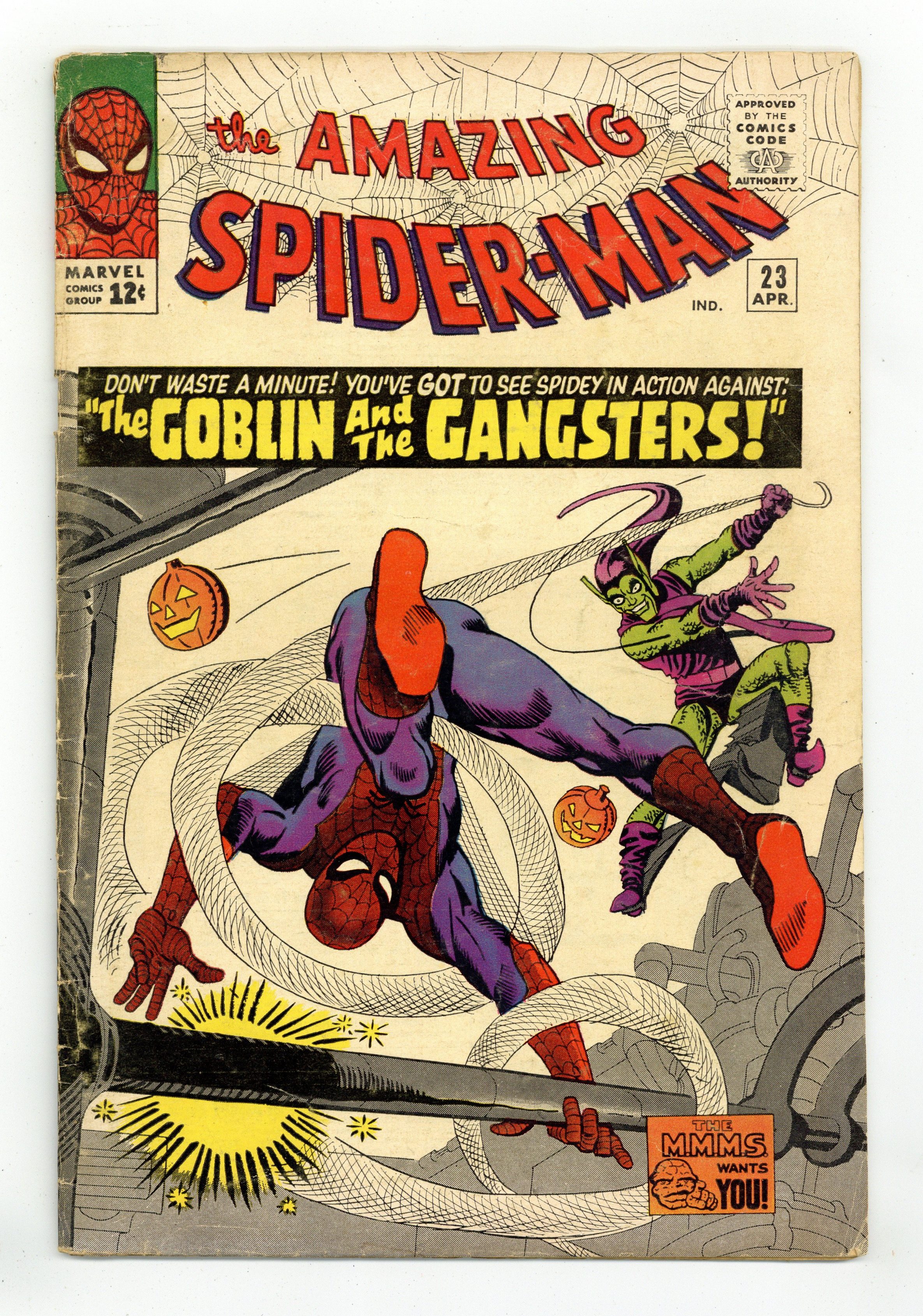 Cover art by Steve Ditko. The Goblin and the Gangsters, script by Stan Lee, art by Steve Ditko; the Green Goblin returns and wants to take over Lucky Lobos mob; Spidey battles Lucky Lobo and his gang; Spidey fights the Green Goblin in a factory. Reprinted in Marvel Tales # 18 and 161. Letter from Jim Shooter, former editor-in-chief at Marvel, critiquing Marvel's handling of Spider-Man. 36 pgs. $0.12. Cover price $0.12. Grade: PR 0.5 explanation of grade Condition: Used (collectible)