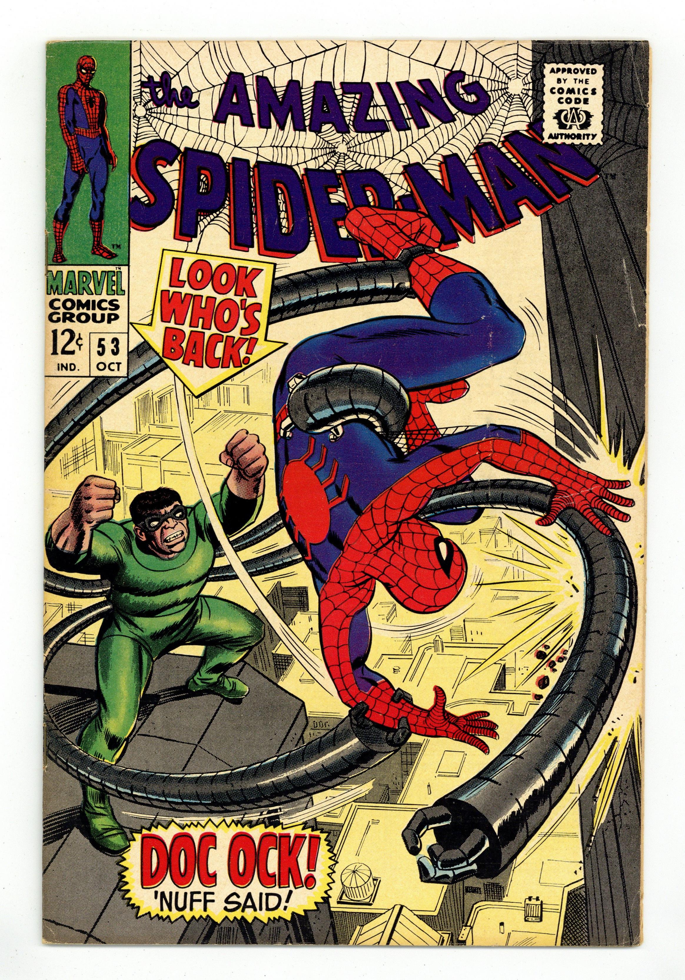 Doctor Octopus. Story synopsis: Peter and Gwen are off to the Science Expo with Professor Warren to see the "nullifier," but unfortunately Dr. Octopus is there too. Only he isn't there to listen to the lecture, he's there to steal it! After putting up a good fight, Spider-Man finally gets the nullifier back, but not before slipping a spider tracer on Doc Ock. Doc Ock finds the tracer when he gets back to his lab and decides to set up a trap for Spidey, but come on, Spidey isn't gonna fall for it. Aunt May and Anna Watson put an ad in the paper looking for a boarder at their house. And guess who answers the ad? That's right, the one and only Otto Octavius. "Enter Dr. Octopus." Script by Stan Lee, pencils by John Romita Sr., inks by Mike Esposito as "Mickey Demeo." Romita cover. Reprinted in Marvel Tales # 38. 36 pgs. Cover price $0.12. Grade: VG/FN 5.0 explanation of grade Condition: Used (collectible)