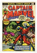 Cover pencils by Jim Starlin, inks by Joe Sinnott. Captain Marvel battles the Super-Skrull (in the guise of Ronan, Megaton, Yon-Rogg, the Hulk, and the Sub-Mariner) in "A Taste of Madness!", script by Mike Friedrich, pencils by Jim Starlin (first work on the series), inks by Chic Stone; In an elaborate scheme of the Skrulls and their mysterious Masterlord, Super-Skrull and Kl'rt, Rick Jones is framed for the murder of Dr. Benjamin Savannah and brought to a run-down police precinct; Using Super-Skrulls invisibility as well as other Skrull technology, Mar-Vell and Rick are led to believe that many of his long-time friends and foes have returned and are attacking him; Rick and Mar-Vell identify the ruse, and Mar-Vell attacks the Skrulls; The building collapses in the battle and the Skrulls escape. 36 pgs., full color. Cover price $0.20. Grade: FN- 5.5 explanation of grade Condition: Used (collectible)