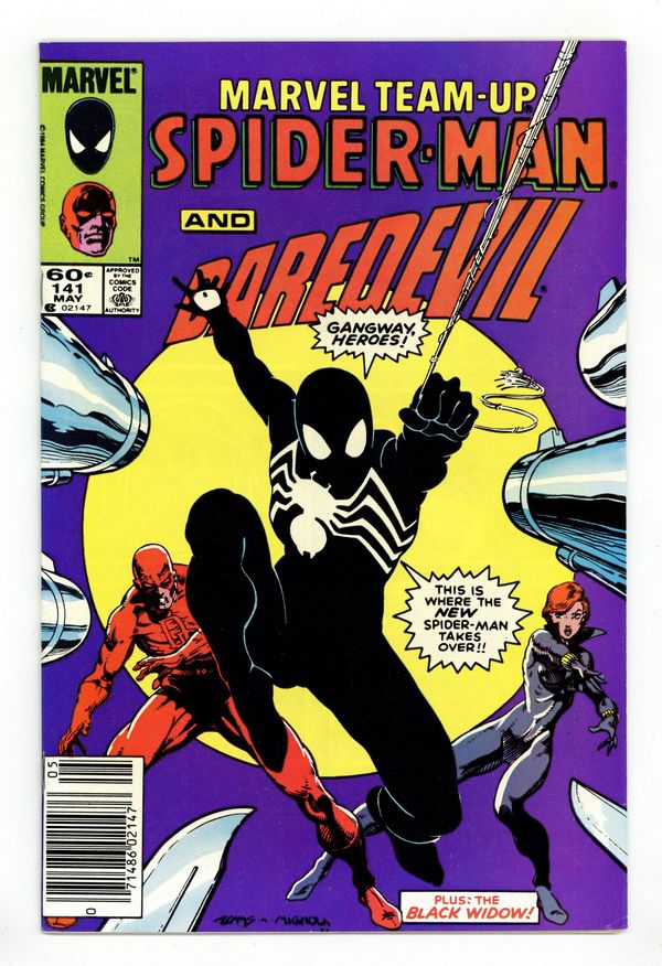 Direct Edition. "Blind Justice!" Part 2 of 2. Guest-starring Spider-Man, the Black Widow, and Daredevil. Plot by Tom DeFalco. Script by Jim Owsley. Art by Greg LaRocque (breakdowns) and Mike Esposito (finishes). Cover by Art Adams and Mike Mignola. Spider-Man is missing! What has happened to the spectacular one? Regardless, Daredevil and the Black Widow must keep working on the pawnbroker murder case in order to prevent an innocent man from going up the river! The Man Without Fear and Natasha just about have the case solved, when the web-slinger suddenly reappears...in a brand new costume! They'll be glad to have Spidey's help to finish this caper...or will they? Daredevil's deal with the Kingpin may not go over too well with your friendly neighborhood Spider-Man! Cameo appearances by the Kingpin, the Arranger, and Dr. Curt Connors. (Notes: Spider-Man's new costume debuted this month in Amazing Spider-Man 252, Spectacular Spider-Man 90, and this issue. The letters page includes a letter from Marvel creator Stan Lee.) 36 pages. Cover price $0.60. Grade: VF 8.0 explanation of grade Condition: Used (collectible)
