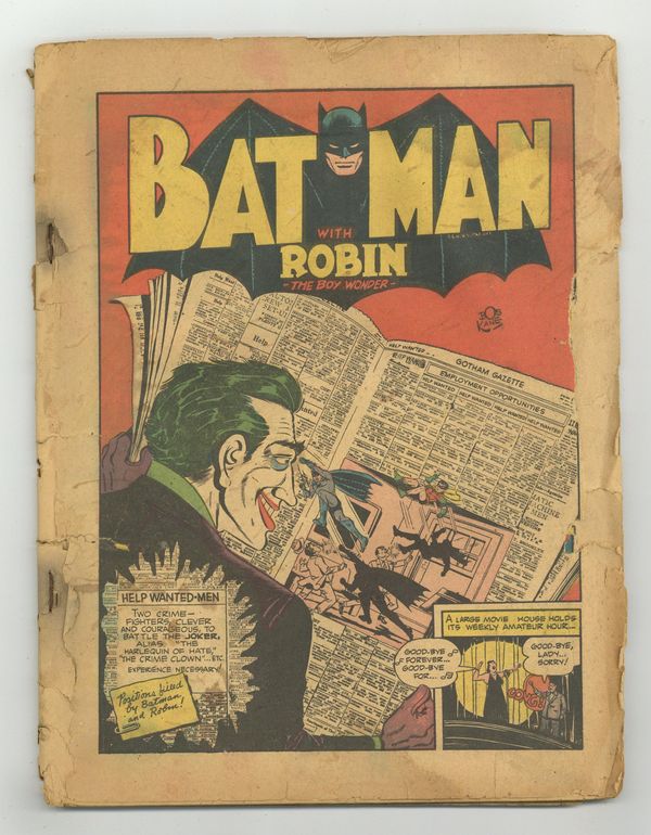 Cover pencils by Fred Ray, inks by Jerry Robinson. "The Joker's Advertising Campaign," script by Bill Finger, pencils by Bob Kane, inks by Jerry Robinson and George Roussos (backgrounds); The Joker escapes from prison and places ads each day in the newspaper to advertize to Batman and Robin his latest criminal pursuit. 1-page Clancy the Cop story by Henry Boltinoff. "Payment In Full," script by Bill Finger, pencils by Bob Kane, inks by Jerry Robinson and George Roussos (backgrounds); Batman discovers that the D.A. faces one of the most difficult decisions of his life: to persecute and send to the chair a criminal who once saved his life. "Bandits In Toyland!", script by Edmond Hamilton, pencils by Bob Kane, inks by Jerry Robinson and George Roussos (backgrounds); Bruce Wayne is called to immediate jury duty and discovers that the defendant has been framed. "All the Angles" text story by Edgar Wilton. "Four Birds of a Feather!", script by Bill Finger, pencils by Bob Kane, inks by Jerry Robinson and George Roussos (backgrounds); The Penguin joins in a financial enterprise with some "old friends" of his to open a night club called The Bird House in Florida.... with gambling as the real racket. 68 Pages, Full Color. Cover price $0.10. Grade: Coverless explanation of grade Condition: Used (collectible)