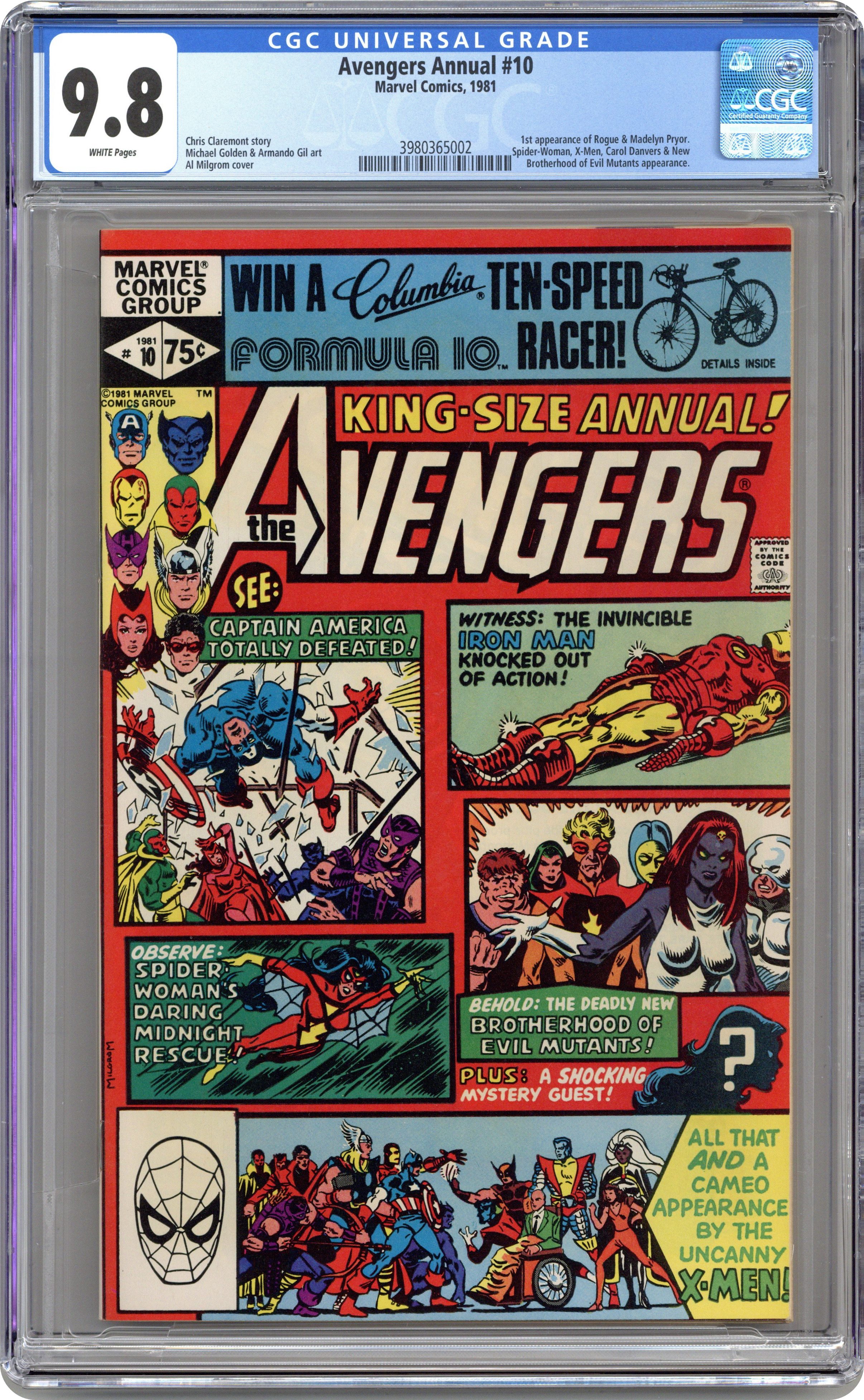 Ended Jul 31 2024 Winning Bid $710 Direct Edition. First appearance of Rogue and Madelyne Pryor in "By My Friends Betrayed!" Spider-Woman, X-Men, Carol Danvers, and New Brotherhood of Mutants guest star. Script by Chris Claremont. Pencils by Michael Golden. Inks by Armando Gil. Cover by Al Milgrom. This action-packed annual has got it all, true believers: the first appearance of Rogue, the spectacular art of Michael Golden, the tragic return of Carol Danvers, and the stupendous struggle between the Brotherhood of Evil Mutants and the mighty Avengers! Following the events of Uncanny X-Men #142, Mystique & her New Brotherhood of Evil Mutants attempt to break four of their members out of Ryker's Island prison! After Rogue and Mystique take down Captain America, Iron Man, and Thor, the rest of the Avengers and Spider-Woman catch up to the villains, and the epic clash erupts! Woven in and around the frantic action at Ryker's Island is the heartbreaking story of Carol Danvers' return to Earth. Her life has fallen apart since leaving for Limbo with Marcus Immortus in Avengers #200, and now, stripped of her powers and memories, Carol begins the long road to recovery. And the first step is an emotional confrontation with her former teammates! Notes: Marvel Super-Heroes #11 (Fall 1992) fills in the details of Carol Danvers' life between Avengers #200 and Avengers Annual #10. The Thing stars in a one-page Hostess ad, "A Lesson to Be Learned!" This issue was reprinted in 1993 in the trade paperback: The Greatest Battles of the Avengers. 52 pages, full color. Cover price $0.75. Grade: CGC 9.8 explanation of grade Condition: Used (collectible)