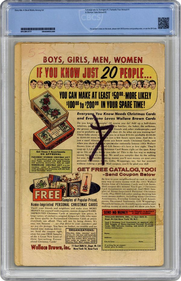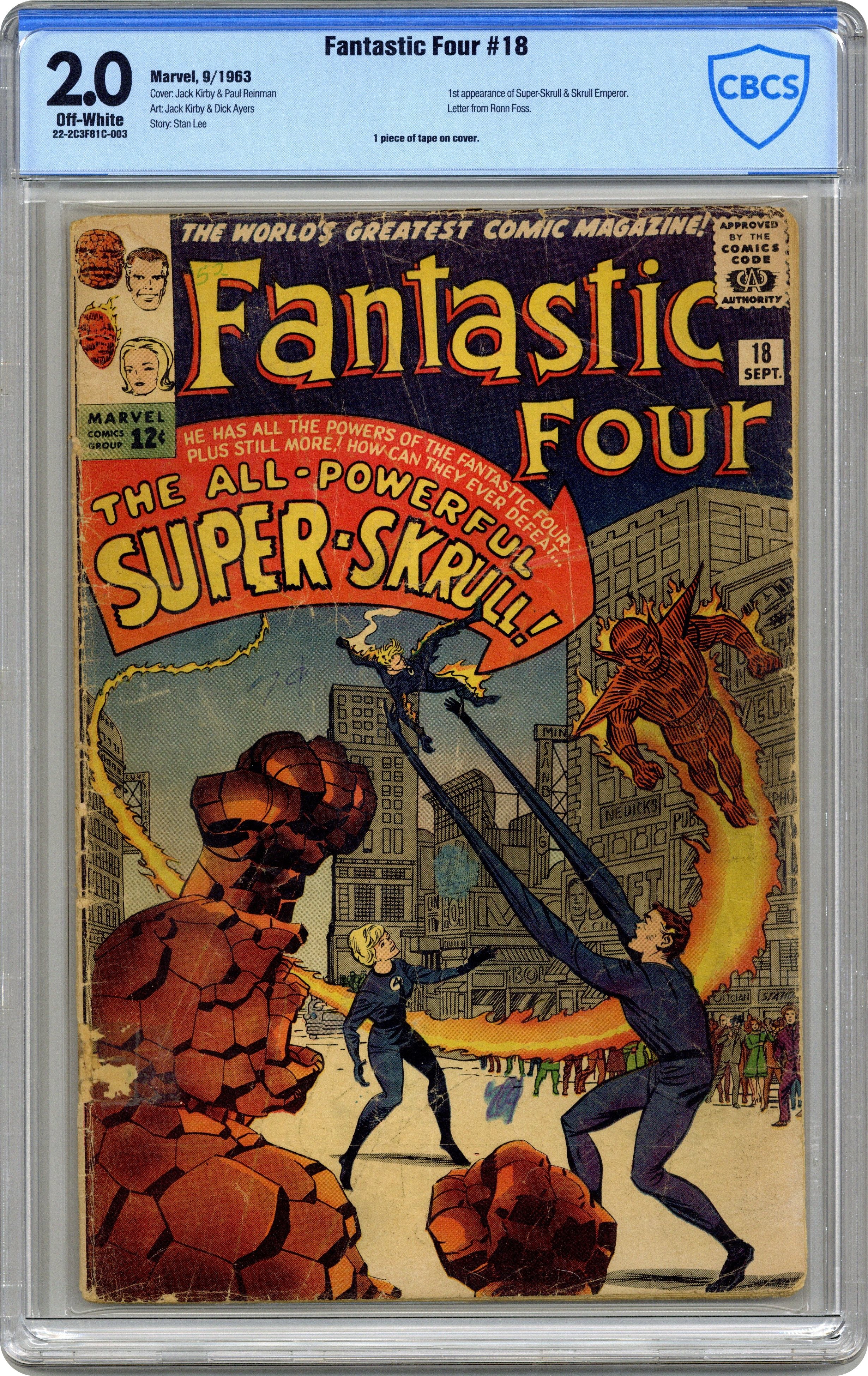 Ended Nov 29 2023 Winning Bid $156 Cover pencils by Jack Kirby, inks by Paul Reinman. Origin and first appearance of the Super Skrull in "A Skrull Walks Among Us!", script by Stan Lee, pencils by Jack Kirby, inks by Dick Ayers; The Skrull Emperor sends the Super-Skrull, a Skrull possessing all the powers of the Fantastic Four, to conquer Earth. In answer to a question from Paul B. Weinstein about who originated the corner cover symbol box, Stan Lee replied: "Steve Ditko dreamed up the idea, and we're sure glad he did!" 36 pgs. $0.12. Cover price $0.12. Grade: CBCS 2.0 explanation of grade Condition: Used (collectible)
