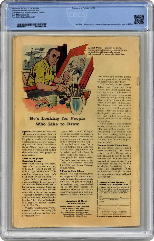 Ended Jun 17 2024 Winning Bid $1,376 Cover pencils by Jack Kirby, inks by Steve Ditko. First appearance of the green Hulk and the Toad Men in "The Terror of the Toad Men," script by Stan Lee, pencils by Jack Kirby, inks by Steve Ditko; The Toad Men are above Earth, in search of its brightest scientist; Rick and Bruce explore an underground cave where they hope to imprison Hulk each night; The Toad men capture Bruce Banner and bring him to their spaceship; Bruce Banner is found in a Toad Men crashed spaceship while their fleet arrives on Earth; Hulk escapes from his cell while General Ross forget about the Toad Men. Fantastic Four ad. 36 pgs., full color. $0.12. Cover price $0.12. Grade: CBCS 3.0 explanation of grade Condition: Used (collectible)