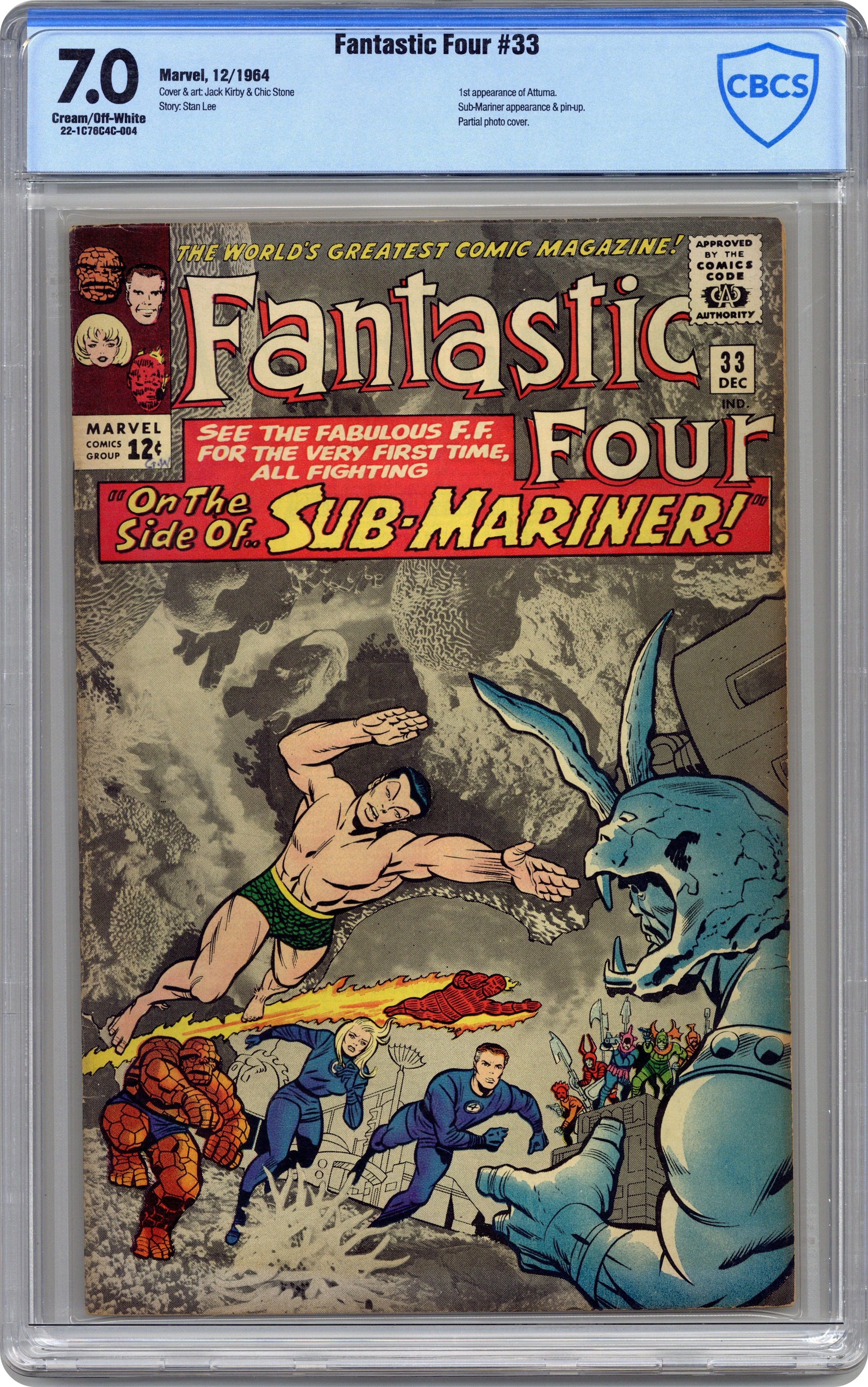 Ended Oct 10 2023 Winning Bid $160 Cover pencils by Jack Kirby, inks by Chic Stone. Side-by-Side with Sub-Mariner!, script by Stan Lee, pencils by Jack Kirby, inks by Chic Stone; Lady Dorma asks the FF for their help in protecting Atlantis from Attuma, a rogue Atlantian Warrior who is trying to usurp Namor's rule. Letter to the editor from comics writer Don McGregor. 36 pgs. $0.12. Cover price $0.12. Grade: CBCS 7.0 explanation of grade Condition: Used (collectible)