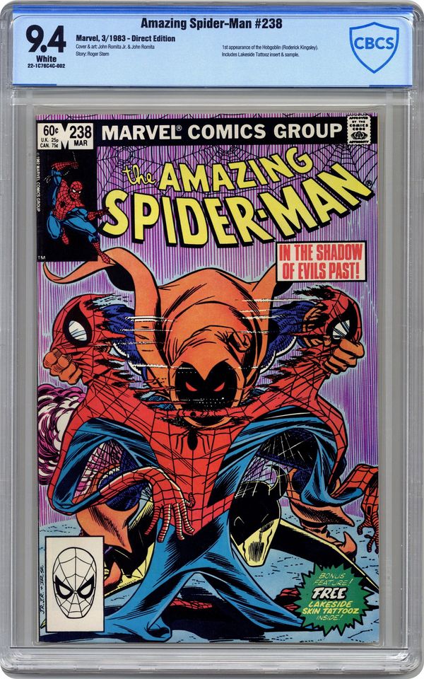 IMPORTANT: Issue 238A HAS the Lakeside Skin Tattooz insert. Direct Edition. First appearance of the Hobgoblin in "Shadow of Evils Past!" Script by Roger Stern. Art by John Romita Jr. (breakdowns) and John Romita Sr. (finishes). Cover by John Romita Jr. and John Romita Sr. One of the landmark issues of the Amazing Spider-Man! And the beginning of the long secret identity mystery of the Hobgoblin! After escaping from the web-slinger, a bank robber stumbles upon an underground hideout of the (deceased) Green Goblin! Not knowing what to do with his discovery, the small-time hood shows the secret lair to an underworld associate! Unfortunately for the wondrous wall-crawler, the devious associate knows exactly what to do: resurrect the Green Goblin...with a twist! And a short time later a new super-villain is born! The Hobgoblin! Cameo appearance by Mary Jane Watson. Flashback cameo by Norman Osborn (aka the Green Goblin). (Notes: The secret identity of the original Hobgoblin takes many twists and turns over the next decade. Who actually operates as the Hobgoblin in this issue is revealed in the Spider-Man: Hobgoblin Lives (1997) Limited Series (written by Roger Stern). This issue was reprinted in Marvel Tales 257 and also in the 1992 trade paperback: the Amazing Spider-Man -- Origin of the Hobgoblin.) 36 pages. Cover price $0.60. Grade: CBCS 9.4 explanation of grade Condition: Used (collectible)
