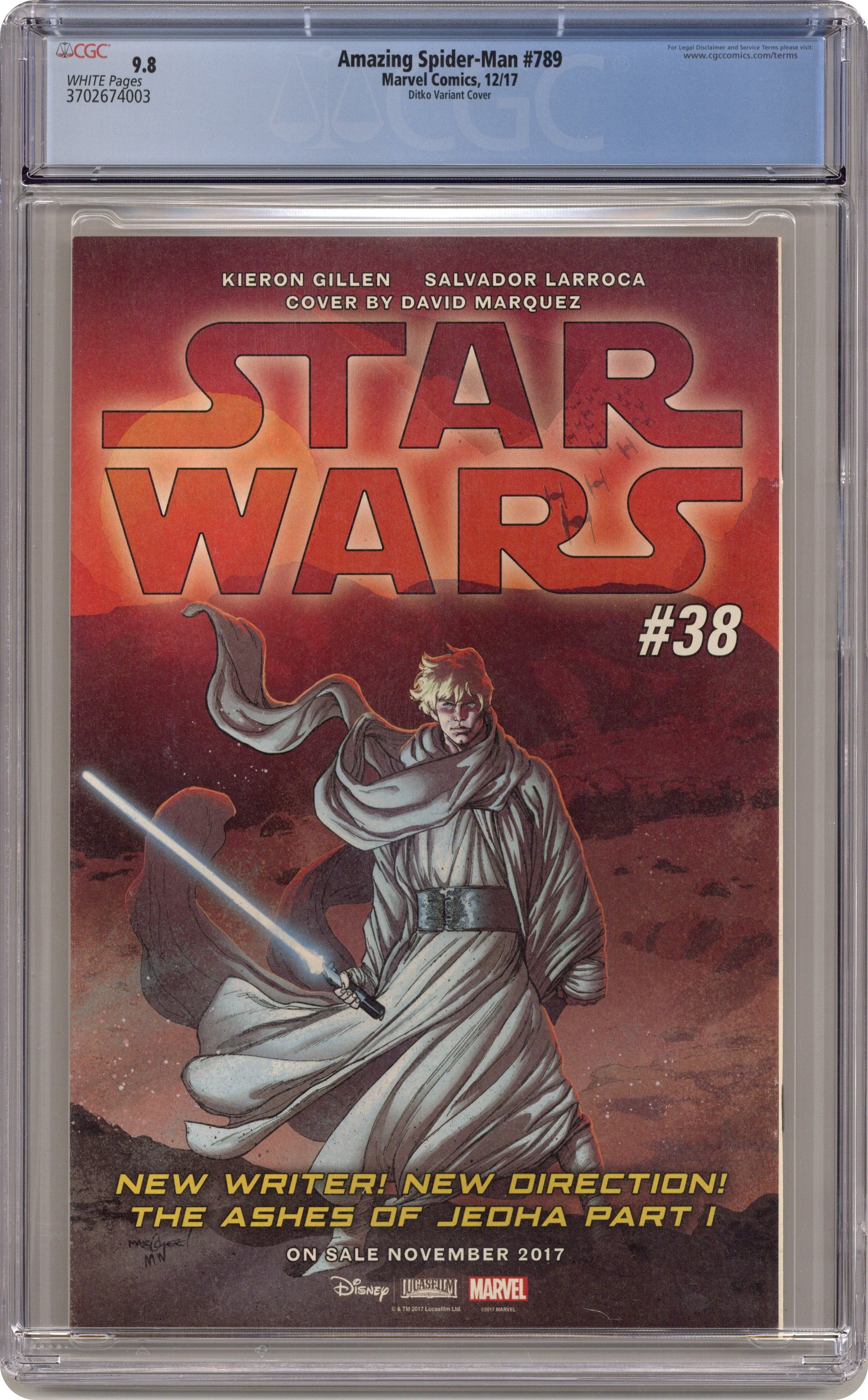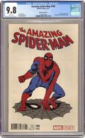 Limited 1 for 50 1965 T-Shirt Variant Cover. Written by Dan Slott. Art by Stuart Immonen. Cover by Steve Ditko. THE FALL OF PARKER Part 1 Down on your luck Peter Parker is back, for good or ill. New York has changed, and so has Peter - but entering a new phase of his Spider-Man life isn't easy; neither are new relationships OR new foes. Peter Parker is not the Spider-Man you remember, but why is he taking his fight to THE DAILY BUGLE? And what happened to PARKER INDUSTRIES? PLUS: Includes 3 bonus MARVEL PRIMER PAGES! Story by Robbie Thompson and art by Mark Bagley! 28 pages, full color. Rated T Cover price $3.99. Grade: CGC 9.8 explanation of grade Condition: Used (collectible)