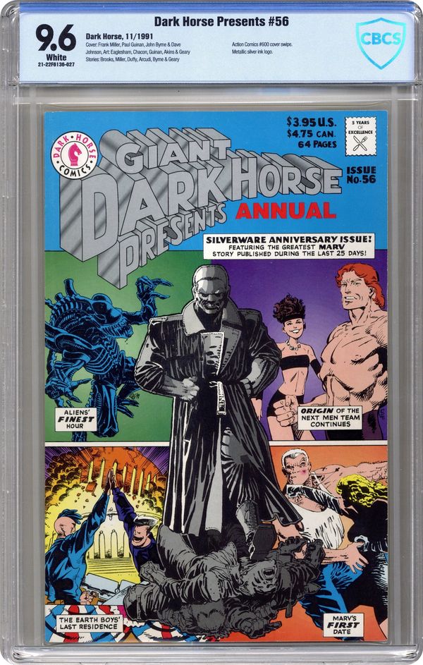 Ended Jun 21 2024 Winning Bid $16 Cover by Frank Miller, John Byrne, Paul Guinan and Dave Johnson. DHP's third giant-sized annual promises to be the best one yet! Frank Miller's ongoing adventure series Sin City headlines this all-star issue, which also includes part three of the four-part introduction to The Next Men by John Byrne; a two-part prologue to Aliens: Genocide by writer John Arcudi and artists Tony Atkins and Paul Guinan (Terminator); "Eldgytha," a tale of medieval sex and savagery by Rick Geary (who also provides the issue with a stunning back cover); the wacky adventures of Cliff Biggers, Brett Brooks, and Dave Johnson's Earth Boys; a bizarre case from the private files of The Creep, by John Arcudi and Dale Eaglesham; and misguided sorcery in Jo Duffy and Jo Chacon's Fancies. This is one issue you can't afford to miss. 32 pages, B&W. Cover price $3.95. Grade: CBCS 9.6 explanation of grade Condition: Used (collectible)