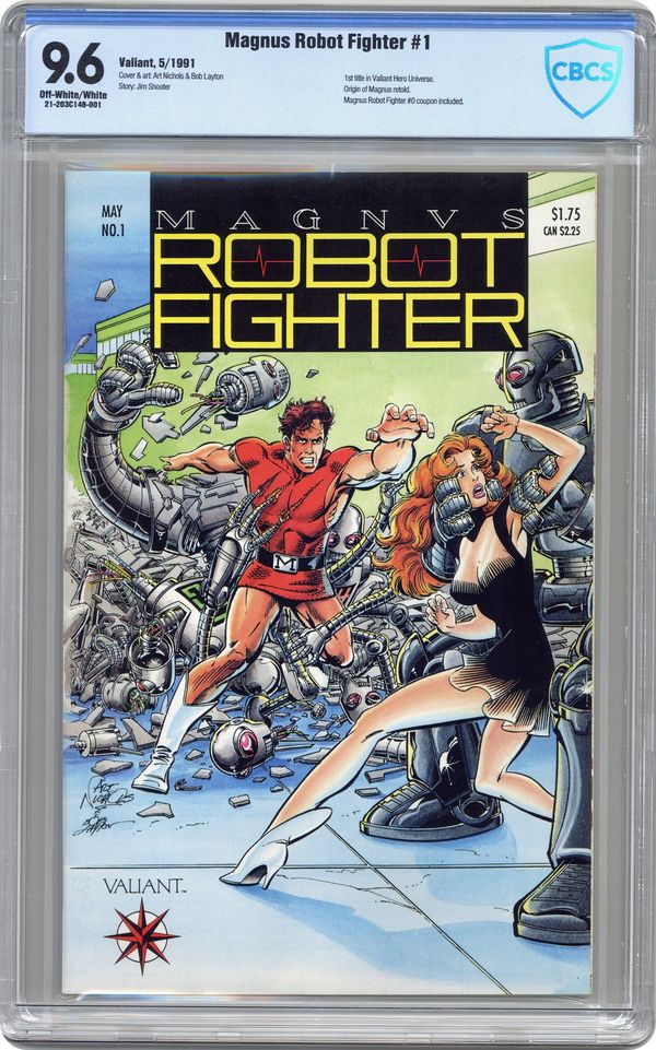 Trading Card insert in centerfold. Coupon is on the back of the trading cards, not separate! Freewill robots learn that there are others like them and start communicating with each other and try to organize and Magnus wonders whether these freewill robots are truly alive and not merely machines in "Steel Nation Part One -- Protector." Story also includes the origin of 1-A. Script by Jim Shooter and art by Art Nichols & Bob Layton & Kathryn Bolinger. Cover price $1.75. Grade: CBCS 9.6 explanation of grade Condition: Used (collectible)