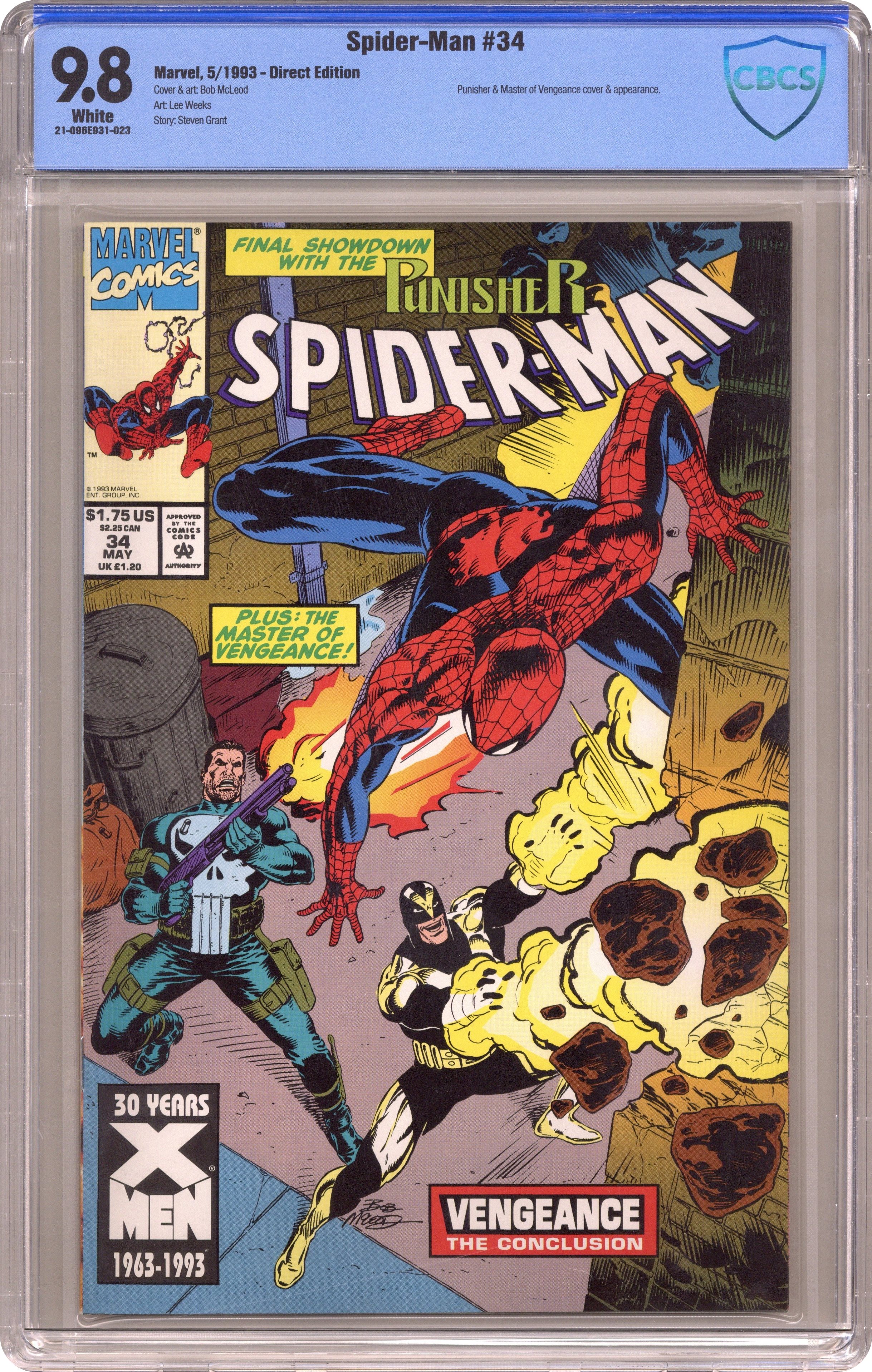 Vengeance Part 3 of 3. Guest-starring the Punisher. Script by Steven Grant. Pencils by Bob McLeod and Lee Weeks. Inks by Bob McLeod. Cover by Bob McLeod. The web-slinger, the Punisher, and the Master of Vengeance battle from cover to cover in an explosive three-way shootout! The wall-crawler wants to send the master to prison, while Frank Castle wants to send him to the morgue. When the Punisher lines up his kill shot, the fate of all three men hangs in the balance. Who will walk away from the fight in one piece? And who will get vengeance? Cameo appearance by Mary Jane Watson. (Note: The Master of Vengeance returns in Spectacular Spider-Man 212.) 32 pages. Cover price $1.75. Grade: CBCS 9.8 explanation of grade Condition: Used (collectible)