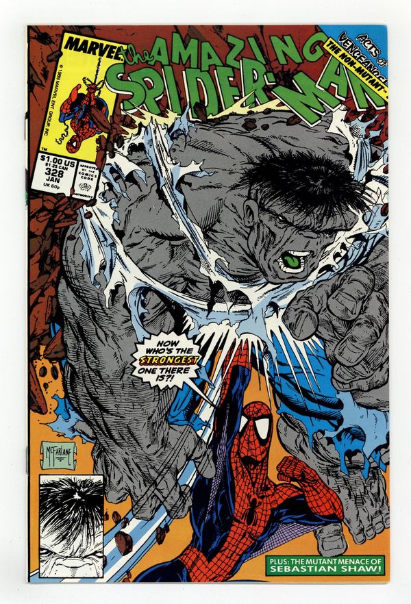 Direct Edition. "Shaw's Gambit" Acts of Vengeance crossover. Guest-starring the Hulk. Script by David Michelinie. Art by Todd McFarlane. Cover by Todd McFarlane. Plot continues from Web of Spider-Man 60. The powerful cabal masterminding the Acts of Vengeance is still trying to kill the web-slinger despite his new cosmic powers! And the next super-villain gunning for Spidey is Sebastian Shaw! However the Hellfire Club's Black King likes to fight by proxy! And who better to use than the Hulk! Shaw picks up the former Green Goliath in the Nevada desert and drops him in the middle of Manhattan! And the battle is joined! The cosmic-powered wall-crawler and the gamma-radiated Hulk throw down from Times Square to the Roosevelt Island ruins! An out-of-this-world ending! Plot continues in Spectacular Spider-Man 160. Cameo appearances by Mary Jane Watson and Flash Thompson. (Notes: This issue completes Todd McFarlane's dynamic 2-year run as the penciler of the Amazing Spider-Man series -- highlighted by the co-creation of Venom (aka Eddie Brock) and the initial Venom story arcs in issues 298-300 and 315-317. This story was reprinted in 1993 in the trade paperback: Spider-Man -- The Cosmic Adventures.) 32 pages. Cover price $1.00. Grade: VF/NM 9.0 explanation of grade Condition: Used (collectible)