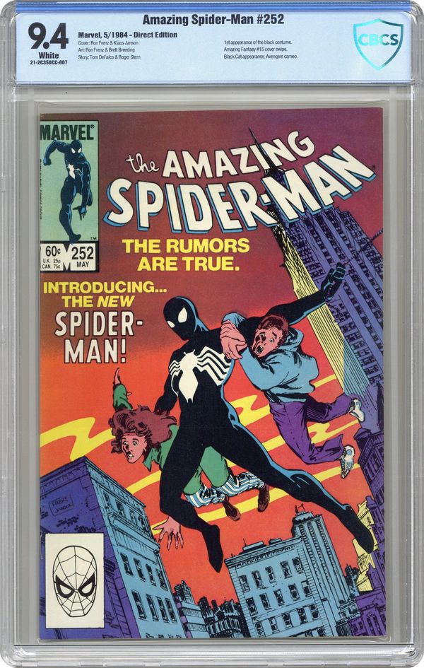 Ended Jun 28 2023 Winning Bid $205 Newsstand Edition. First appearance of Spider-Man's new black (alien symbiote) costume in "Homecoming!" Plot by Roger Stern. Script by Tom DeFalco. Pencils by Ron Frenz (breakdowns) and Brett Breeding (finishes). Cover by Ron Frenz and Klaus Janson. One of the landmark issues of the Amazing Spider-Man! With a brilliant flash of light in Central Park, the wondrous wall-crawler is back! And he looks a whole lot different! Wow, a new costume! What happened during the Secret Wars on the Beyonder's world? The ominous truth will be revealed to both the readers and the web-slinger in the days and weeks ahead! Cameo appearances by the Black Cat, Dr. Curt Connors, J. Jonah Jameson, Joe Robertson , Aunt May, Captain America, Captain Marvel, Hawkeye, Iron Man, Thor, and the Wasp. (Notes: Marvel Age 12 contained sketches of the new costume two months prior to the publication of this issue. Spidey's new costume was also unveiled in Marvel Team-Up 141 and Spectacular Spider-Man 90. The first issue of the (1984) Marvel Super Heroes Secret Wars Limited Series was published the same month as Amazing Spider-Man 252. The web-slinger discovers his new costume in issue 8 of the limited series. The Frenz-Janson cover is a tribute to the iconic cover of Amazing Fantasy 15. This story was reprinted in Marvel Tales 266. The letters page contains a statement of ownership: average print run 470,527; average paid circulation: 241,762. 36 pgs. Cover price $0.60. Grade: CBCS 9.4 explanation of grade Condition: Used (collectible)