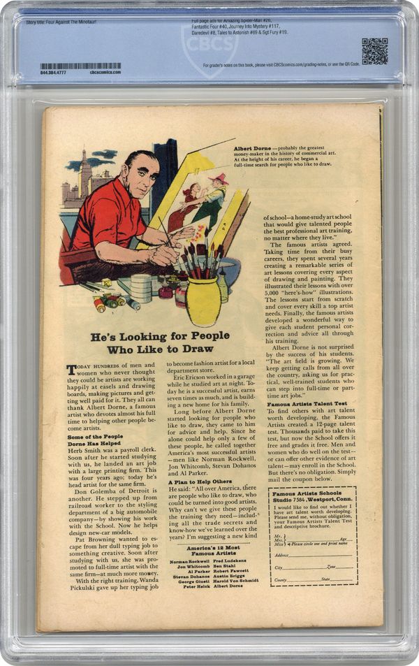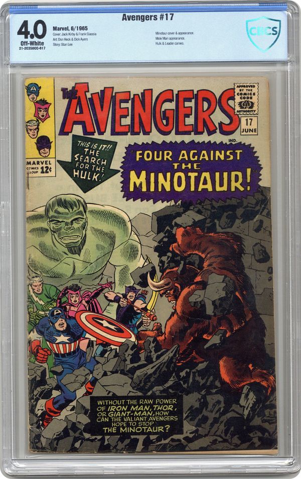 "Four Against the Minotaur!" Script by Stan Lee, pencils by Don Heck (some faces retouched by Jack Kirby), inks by Dick Ayers. Avengers Roll Call: Captain America, Hawkeye, Quicksilver, Scarlet Witch, and Rick Jones. Villains: the Mole Man, the Leader, and the first and only appearance of a minotaur. Guest appearance by the Hulk. As this and the story from Tales to Astonish 69 take place at the same time, some panels are reproductions of the Astonish panels. Reprinted in Marvel Triple Action # 11. Kirby/Frank Giacoia cover. 36 pgs. Cover price $0.12. Grade: CBCS 4.0 explanation of grade Condition: Used (collectible)