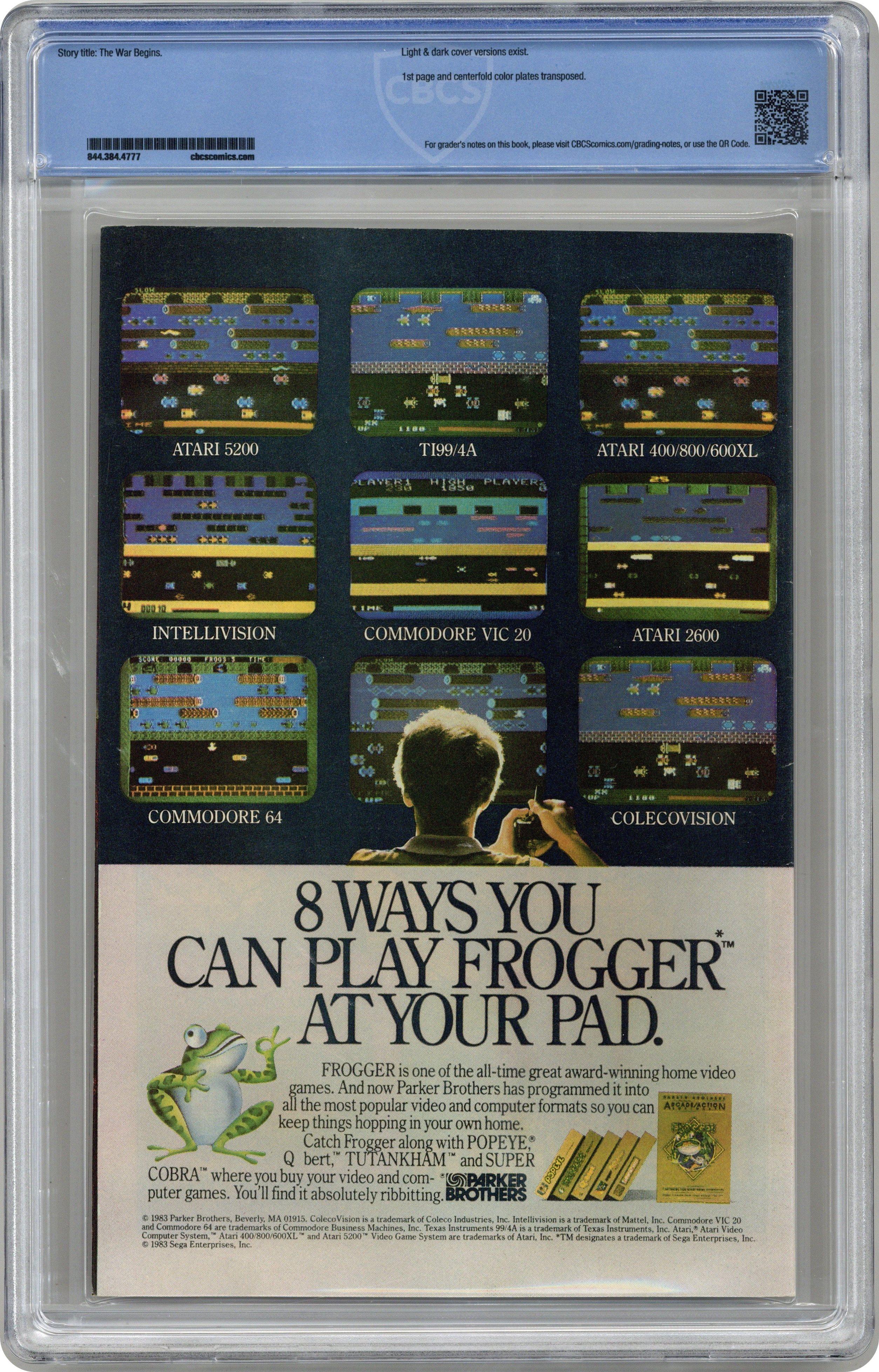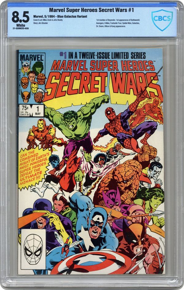 Direct Edition. "The War Begins!" Part 1 of 12. Story by Jim Shooter. Art by Mike Zeck and John Beatty. This is it, the granddaddy of all epic events. Before Identity Crisis, Infinite Crisis, House of M, Civil War, and Infinity Gauntlet there was Secret Wars. A nigh omnipotent being from beyond has, for lack of a better word, kidnapped the greatest heroes and deadliest villains in the Marvel Universe and whisked them to the far side of the universe to battle for the ultimate prize. One thing is for certain, the lives of these heroes and villains will never be the same again. - This is the first printing. Any 2nd printing will have the words "Second Printing" at the bottom of the first page. NOTE: Nearly all first printings contain a "Blue Galactus" from a printing error (a lack of magenta printing plates) that was corrected in later printings. While small number of First printings may have the correct colors, the majority of copies will have "Blue Galactus". Due to the frequency, "Blue Galactus" variants should be treated the same as other First Printings. 36 pages, full color. Cover price $0.75. Grade: CBCS 8.5 explanation of grade Condition: Used (collectible)