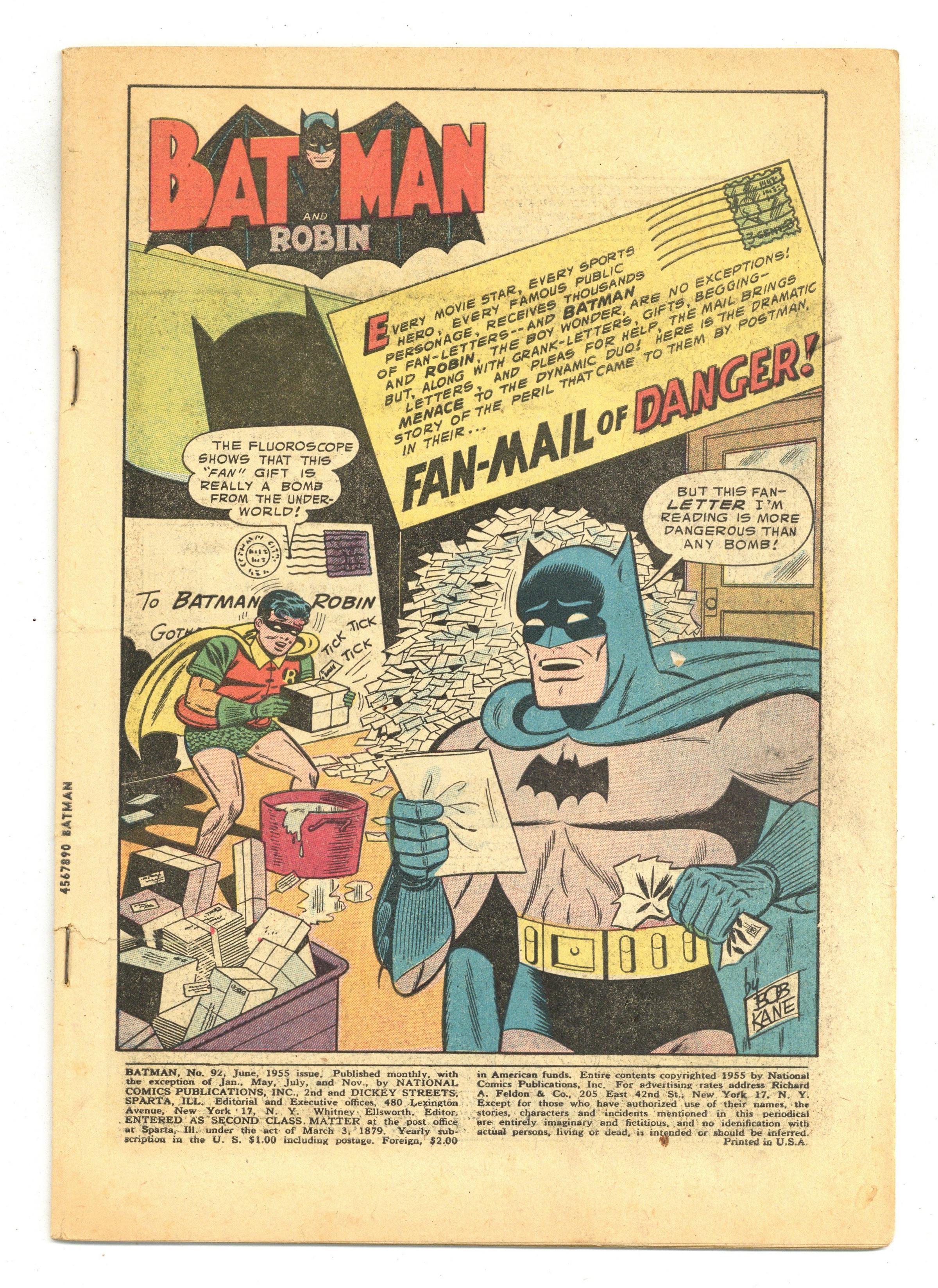 Cover by Win Mortimer. "Fan-Mail of Danger!", script by Bill Finger, pencils by Sheldon Moldoff, inks by Charles Paris; Swamped by fan mail, Batman hires a secretary to handle all of it, who, unwittingly, causes the volume of mail to increase, thus hampering the Caped Crusader's war on crime; A threat from a forger, who has obtained an example of Batman's signature and who attempts to uncover Batman's true identity from it, has to be stopped in his tracks. 2/3-page Casey the Cop story by Henry Boltinoff. "Batman's Guilty Neighbor!", script by Dave Wood, pencils by Sheldon Moldoff, inks by Charles Paris; Bruce's new neighbor, Cal Tremont, is suspected in a series of crimes and it's up to the Caped Crusader to track down the guilty party and clear Cal's name. 2-page Casey the Cop story by Henry Boltinoff. College for Camera Cops article by Jack Miller. -page Shorty story by Henry Boltinoff. First appearance of Ace, the Bat-Hound in "Ace, the Bat-Hound!", script by Bill Finger, pencils by Sheldon Moldoff, inks by Stan Kaye; When Batman and Robin find an injured dog they they take it back to the Batcave; The dog helps them with a few cases and leads them to the crooks who kidnapped his master. There May Be a Career in Health for You! public service announcement with Buzzy, script by Jack Schiff, art by Win Mortimer. 36 Pages, Full Color. Cover price $0.10. Grade: Coverless explanation of grade Condition: Used (collectible)