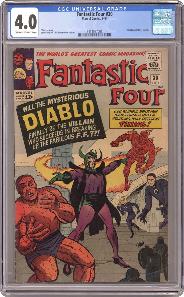 Ended Oct 13 2023 Winning Bid $53 "The Dreaded Diablo!" Written by Stan Lee. Pencils by Jack Kirby. Inks by Chic Stone. Cover pencils by Jack Kirby with inks by Chic Stone. On a vacation in Transylvania, the FF encounter a castle inhabited by Diablo. Note: First Appearance of Diablo. 36 pgs. Cover price $0.12. Grade: CGC 4.0 explanation of grade Condition: Used (collectible)