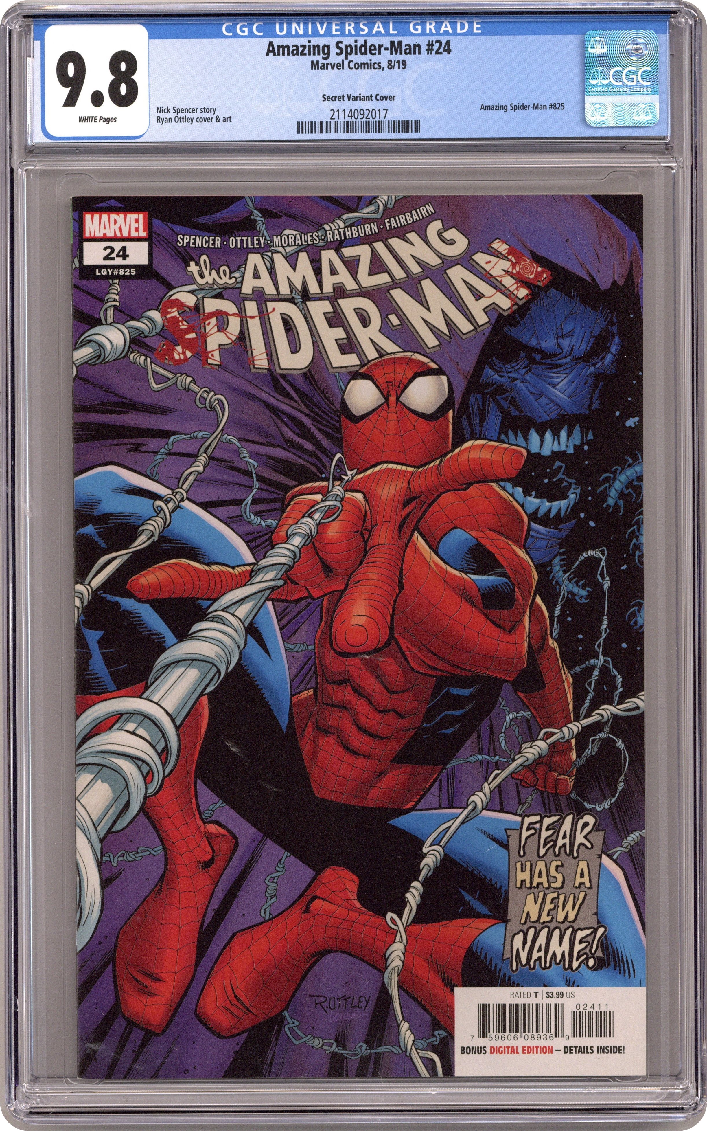 Written by Nick Spencer. Art and Cover by Ryan Ottley. All leading up to Nick Spencer's Landmark 25th issue! One issue away from #25 and the chickens are coming home to roost. Who is the mysterious bandaged figure who seems to be in every shadow and what does he want with Spider-Man? This issue won't answer ALL your questions, but it will answer some that will drop your jaw. 28 pages, full color. Rated T Cover price $3.99. Grade: CGC 9.8 explanation of grade Condition: Used (collectible)