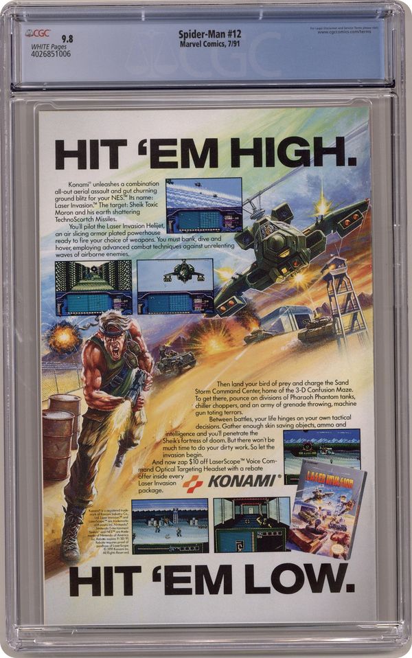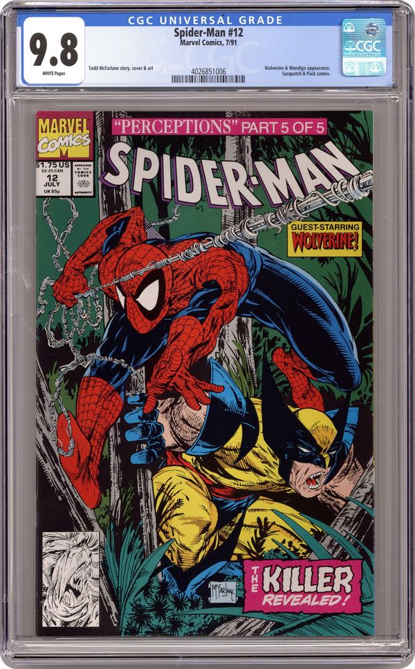 Direct Edition. Perceptions Part 5 of 5. Guest-starring Wolverine. Script and pencils by Todd McFarlane. Inks by Todd McFarlane and Scott Williams. Cover by Todd McFarlane. The moment of truth arrives north of the border as Wolverine and the Amazing Spider-Man close in on the child killer! Logan and the web-slinger know the Wendigo is innocent. And they have a plan to draw out the murderer...and draw him into the woods...where justice awaits! But as usual the wall-crawler and Wolverine disagree over the appropriate method to use -- in order to obtain a confession. Will the heroes' conflict allow the killer to walk free? Cameo appearances by Puck and Sasquatch. 32 pages. Cover price $1.75. Grade: CGC 9.8 explanation of grade Condition: Used (collectible)