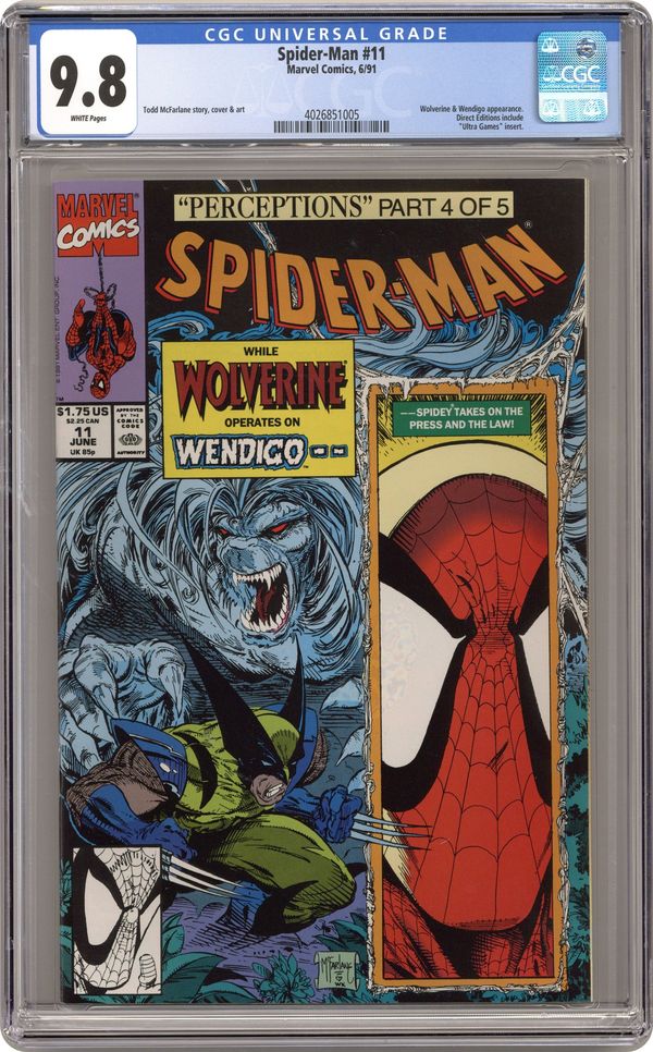 Perceptions Part 4 of 5. Guest-starring Wolverine. Script and pencils by Todd McFarlane. Inks by Todd McFarlane and Rick Maygar. Cover by Todd McFarlane. Wolverine and the web-slinger launch a two-pronged plan to uncover the killer in the Canadian wilderness. Peter goes to the local media and the town police to tell them that a person committed the murders -- not the Wendigo! But unfortunately, no one believes him. Meanwhile in the woods, Wolverine makes peace with the Wendigo...and then unearths another dead child's body. The explosive conclusion is coming next issue! 36 pages. Cover price $1.75. Grade: CGC 9.8 explanation of grade Condition: Used (collectible)