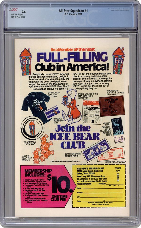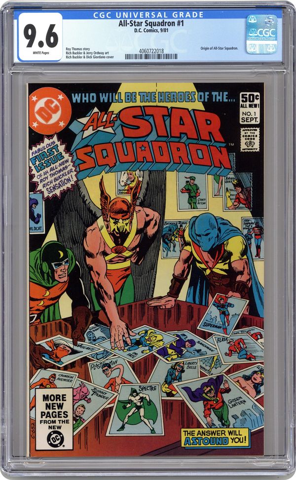 Direct Edition. Cover pencils by Rich Buckler, inks by Dick Giordano. The World on Fire!, script by Roy Thomas, pencils by Rich Buckler, inks by Jerry Ordway; As the 3 non-missing JSA members (Hawkman, Atom, Dr. Mid-Nite) join up with Plastic Man, Robotman, Liberty Belle, Johnny Quick, Shining Knight, and Danette Reilly in Washington, D.C., they meet with President FDR, who creates a new group, the All-Star Squadron; Their mission: find the missing JSA'ers and stop the scheduled bombing of Pearl Harbor on Dec. 7, 1941 before it's too late; Meanwhile, the missing JSA'ers have been captured by Per Degaton and made aware of his plans, helpless to stop him. An Open Letter to the Readers of All-Star Squadron #1 by Roy Thomas. Cover price $0.50. Grade: CGC 9.6 explanation of grade Condition: Used (collectible)