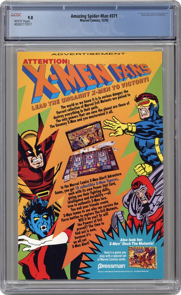 "One Clue over the Cuckoo's Nest" Invasion of the Spider-Slayers Part 4 of 6. Script by David Michelinie. Pencils by Mark Bagley. Inks by Randy Emberlin. Cover by Mark Bagley and Randy Emberlin. The web-slinger and the Black Cat drive to Long Island to investigate the whereabouts of Max Young -- the protégé of the deceased Professor Mendel Stromm! The amazing one thinks Young is involved in the spider-slayer attacks! And shortly after arriving at the private sanitarium, the wall-crawler's suspicions are confirmed! A giant tri-headed robot ambushes Spidey and Felicia! Can Spider-Man and the new-and-improved Black Cat knock out one more mechanical foe? Cameo appearances by Mary Jane Watson, Richard Parker, and Mary Parker. Backup story: "Strained Relations" Script by Al Milgrom. Pencils by Aaron Lopresti. Inks by Don Hudson. While on the set of a new movie, Mary Jane ponders what her future will be like with Peter's parents. Retelling of Mary Jane's origin. (Note: This issue includes a full-page ad for the new Spider-Man 2099 series.) 36 pages. Cover price $1.25. Grade: CGC 9.8 explanation of grade Condition: Used (collectible)