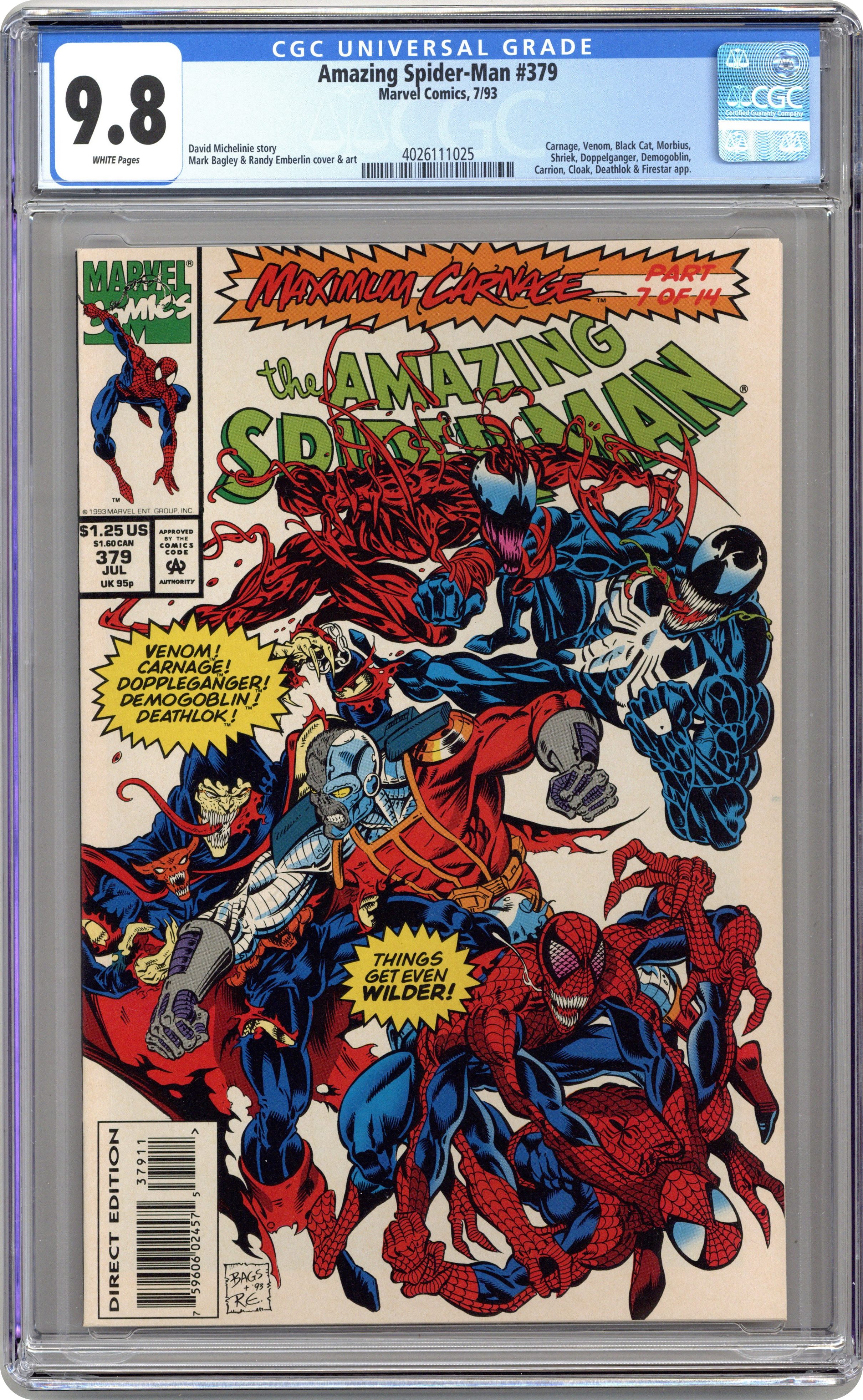 Direct Edition. "The Gathering Storm" Maximum Carnage Part 7 of 14. Guest-starring Cloak, Deathlok, and Firestar. Script by David Michelinie. Pencils by Mark Bagley. Inks by Randy Emberlin. Cover by Mark Bagley and Randy Emberlin. Story continues from Web of Spider-Man 102. The heroes (if Morbius and Venom can be called heroes) scored a small victory over Carnage last night by driving off the serial killer and his vicious partners after they attacked a midtown nightclub. Now the web-slinger, Felicia, Cloak, and Venom meet to discuss ways to defeat Carnage permanently. Venom admits that the symbiote is vulnerable to sonic gun blasts or very intense heat! But where can both of those be found? Four Freedoms Plaza! Meanwhile at New York's Metropolitan Museum, Carnage begins another rampage! However, a powerful superhero has detected the incredible violence from cyberspace! Deathlok arrives on the scene and quickly scores hits on the Demogoblin, doppelganger, and Carrion! Wow, is the Demolisher going to end this carnage right here and now? Story continues in Spider-Man 36. (Notes: This issue features Marvel's Maximum Anniversary X-Perience! The 15-page insert celebrates the 30th anniversaries of both the X-Men and the Avengers.) 52 pages Cover price $1.25. Grade: CGC 9.8 explanation of grade Condition: Used (collectible)