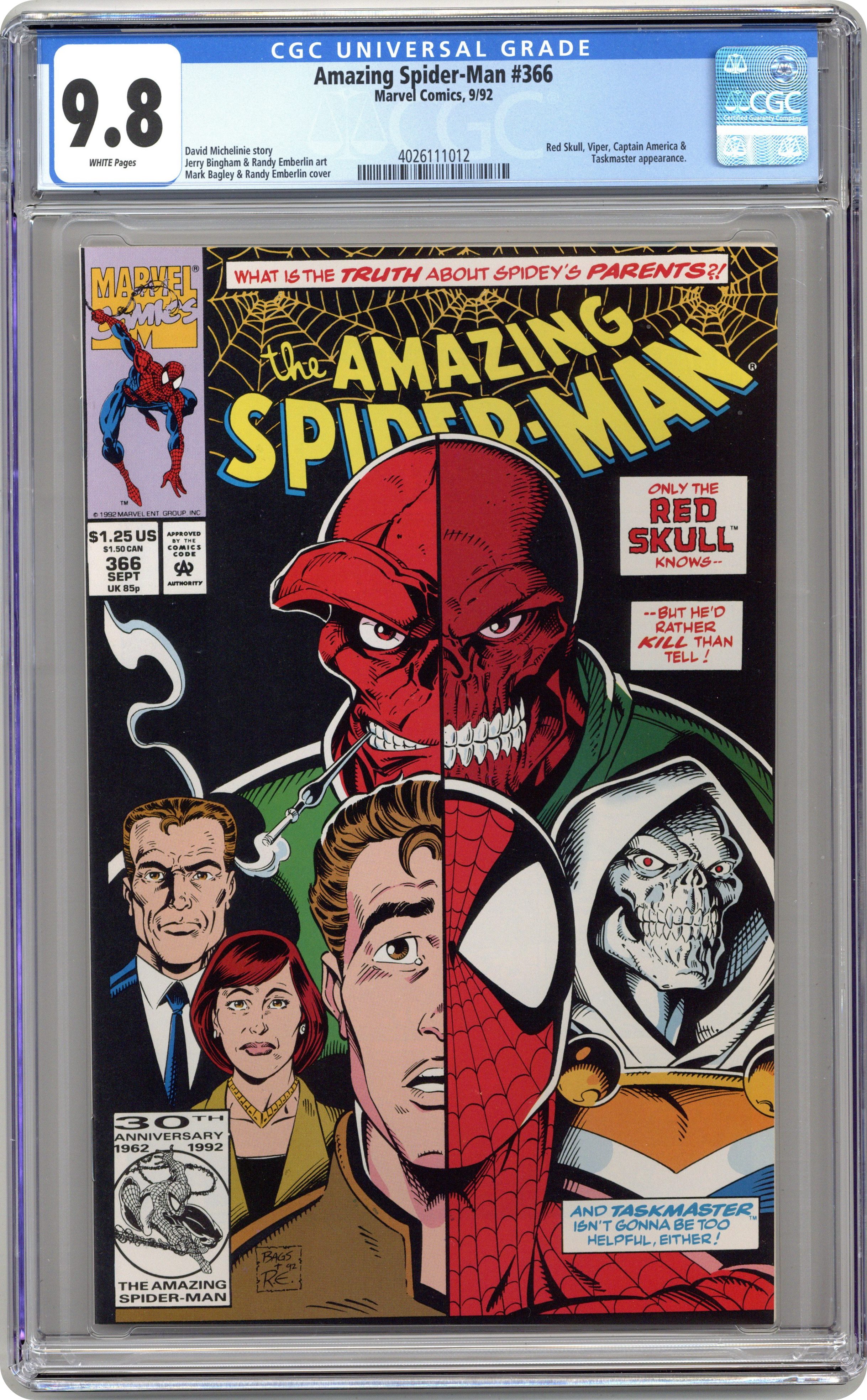 "Skullwork! Part 1 of 2. Script by David Michelinie. Pencils by Jerry Bingham. Inks by Randy Emberlin. Cover by Mark Bagley and Randy Emberlin. Peter Parker is in a state of shock after the dramatic return of his parents! Both he and his aunt thought they had died many years ago while working as undercover agents for the U.S. government! But here they are in the flesh in Queens, New York! After the awkward meeting, the web-slinger begins his fact-finding based upon his adventure in Amazing Spider-Man Annual 5 (published in 1968). And that means locating the notorious RedSkull! Not exactly a fun way to research your family genealogy! Cameo appearances by Mary Jane Watson, J. Jonah Jameson, Captain America, Solo, Taskmaster, and the Viper. Flashback cameos by Ben Parker and the second Red Skull (aka Albert Malik). (Note: The wall-crawler previously tangled with the Red Skull in the Assassin Nation Plot in Amazing Spider-Man 320-325.) 36 pages. Cover price $1.25. Grade: CGC 9.8 explanation of grade Condition: Used (collectible)