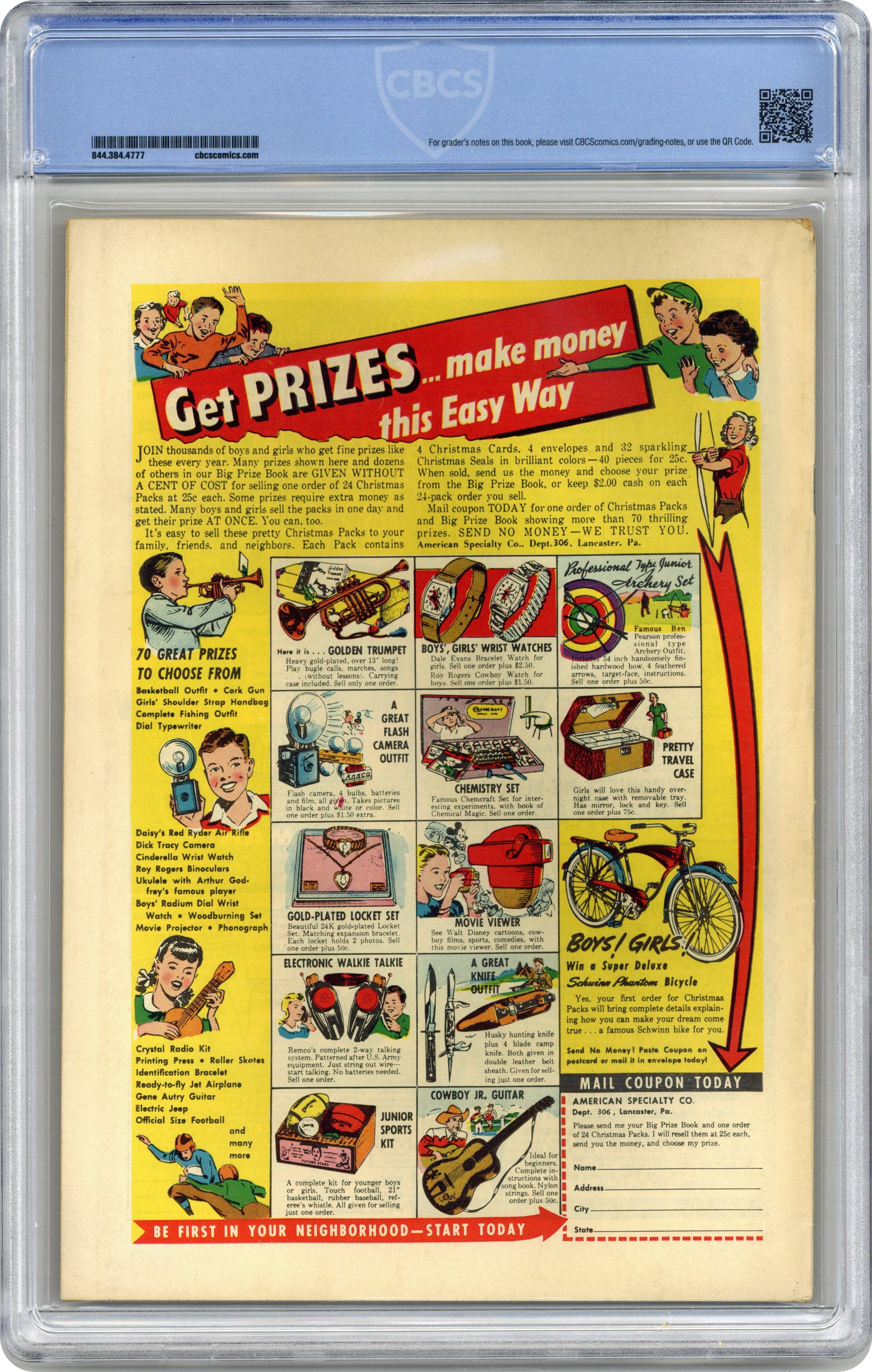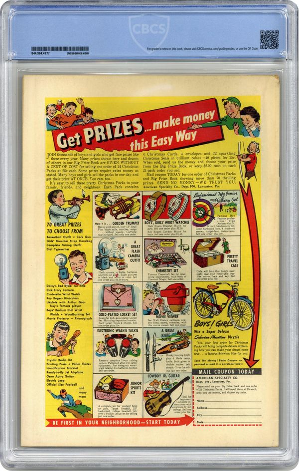 Ended Apr 25 2023 Winning Bid $150 Cover art by Sol Brodsky. Age Before Beauty, art by Sid Lawrence; A 45 year old man lands on a planet and marries a woman who is 21. No Evidence!, art by Louis Ravielli; A communist spy who steals state secrets by swallowing them and then getting his stomach pumped swallows a concentrated atomic energy capsule which burns a gaping hole through his belly. The End of the World!, art by Al Eadeh; An alien pacifist attempts to disguise himself as an earthling and warn the president of impending alien attack, but fails. Death Where is thy Sting, art by Don Perlin. The Hidden Planet!, art by Robert Q. Sale. 36 pgs. $0.10. Cover price $0.10. Grade: CBCS 4.5 explanation of grade Condition: Used (collectible)