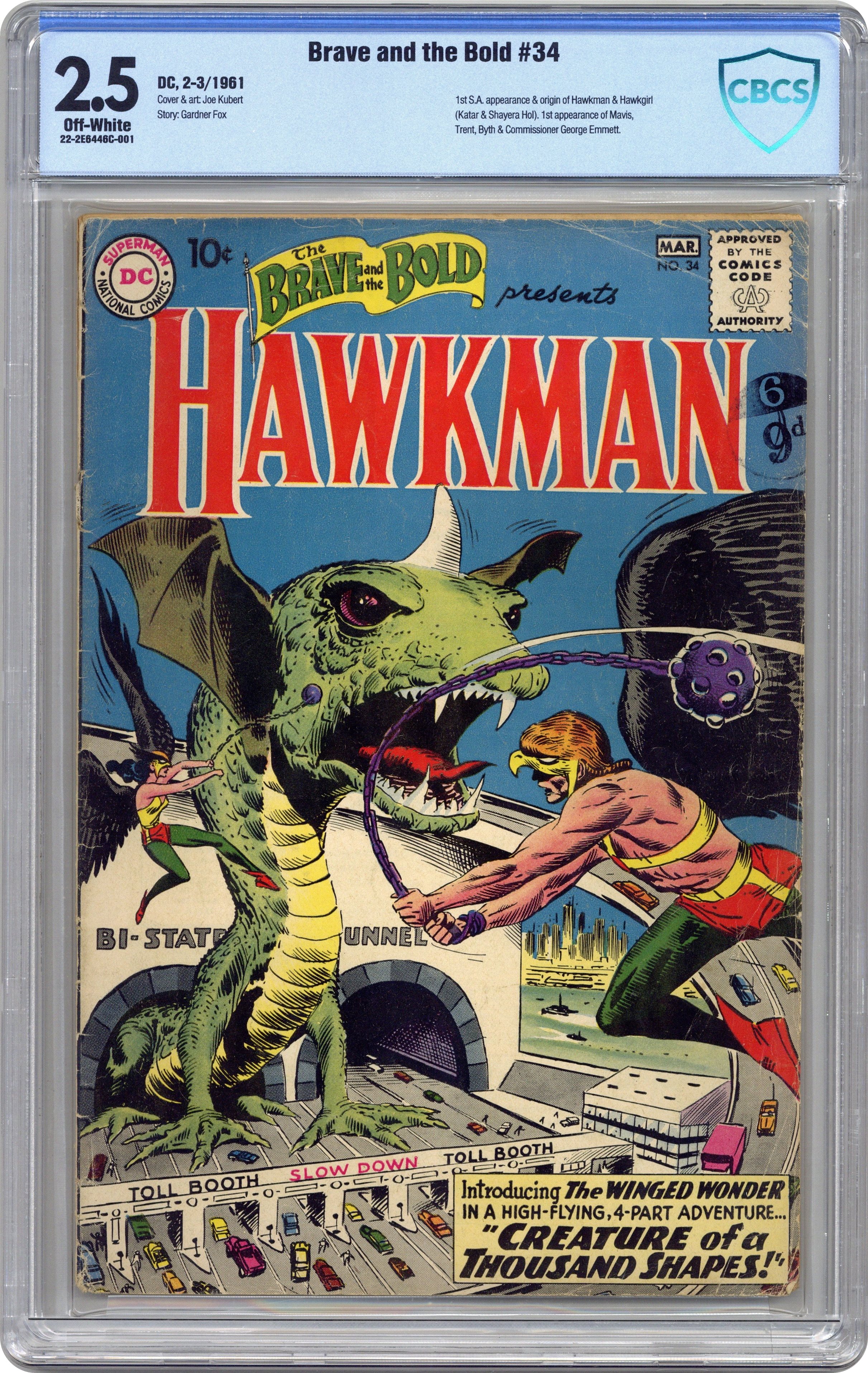 Ended Apr 29 2023 Winning Bid $250 Cover by Joe Kubert. 1st Silver Age appearance of Hawkman in "Creature of a Thousand Shapes!", script by Gardner Fox, art by Joe Kubert; Katar and his wife Shayera, police officers from the Planet Thanagar, come to Earth in pursuit of a shape-shifting criminal from their world; Police Commissioner Emmett helps them to establish secret identities, and, after they have succeeded in their mission, helps convince them to stay on Earth. Letter to the editor from comic writer Roy Thomas. 36 Pages, Full Color. Cover price $0.10. Grade: CBCS 2.5 explanation of grade Condition: Used (collectible)
