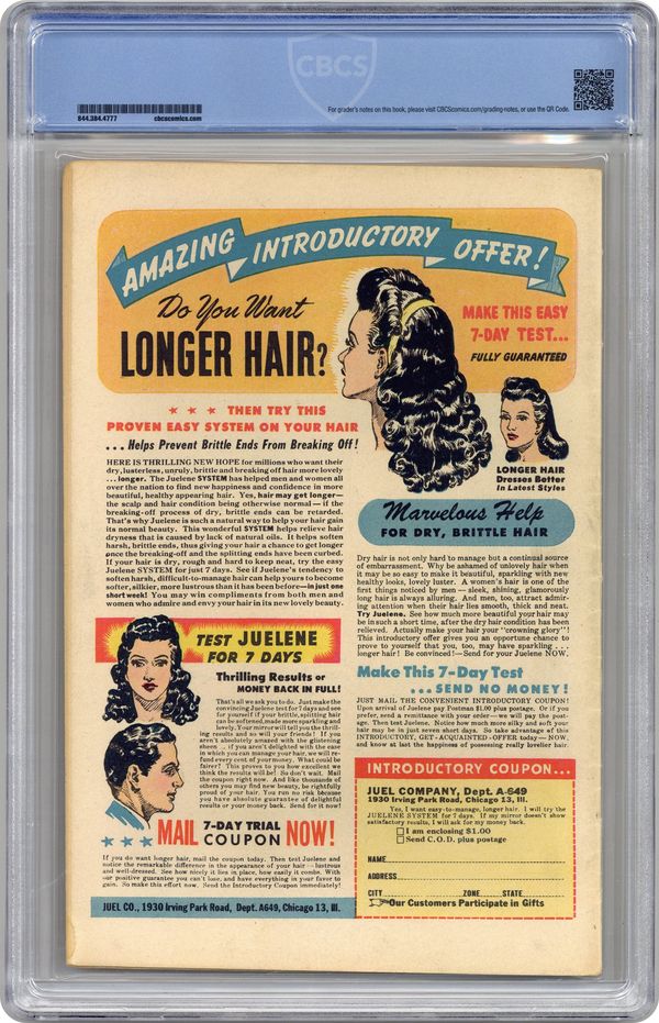 Ended Feb 5 2024 Winning Bid $440 Cover by Alex Schomburg. Stories by unknown. Art by unknown. In this issue: untitled The Black Terror story; The Fighting Yank in "The Blinding Light"; Pyroman in "The Radio Activator"; and Doc Strange in "The Miner"! Plus: 1-page A Manhunt Story text story "Danny's Phone Call" (by Gerald Devers - a house name); 1-page A Story of Alaska text story "Gold Claim" (by Jack Devon); and 1-page A Western Story text story "A Real Cowboy" (by Neal Douglas). 48 pages, full color. Cover price $0.10. Grade: CBCS 3.5 explanation of grade Condition: Used (collectible)