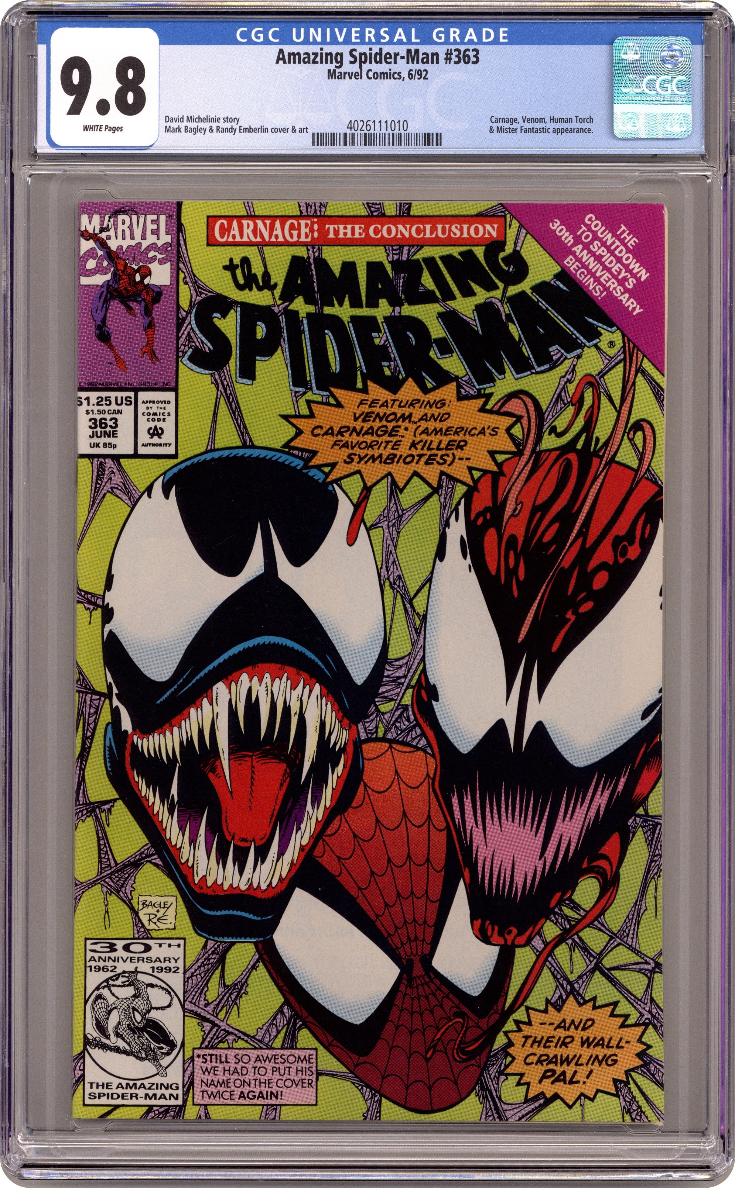 Direct Edition. "Savage Grace!" Part 3 of 3. Script by David Michelinie. Pencils by Mark Bagley. Inks by Randy Emberlin. Cover by Mark Bagley and Randy Emberlin. Carnage takes J. Jonah Jameson hostage and drags him to a heavy metal concert at Madison Square Garden! The psychotic killer plans to execute JJJ in front of thousands of headbangers! But before Carnage can deliver the deathblow, Spider-Man and Venom strike! The ferocious fight leads into the subway tunnels and then back onto the concert stage! Where thanks to MSG's awesome sound system, the web-slinger tries to knock out both Carnage and Venom! The wall-crawler's ploy better work, because double-crossing Venom could have lethal consequences! A fantastic finish! First appearances of the Richard Parker and Mary Parker life model decoys (LMD's). Cameo appearances by Joe Robertson, Mr. Fantastic, and the Human Torch. (Notes: Venom appears next in the one-shot: Spider-Man Special Edition -- The Trial of Venom (1992). Carnage returns in the first issue of Spider-Man Unlimited (1993 1st series) to kick off the Maximum Carnage saga.) 36 pages. $1.25 cover price. Cover price $1.25. Grade: CGC 9.8 explanation of grade Condition: Used (collectible)