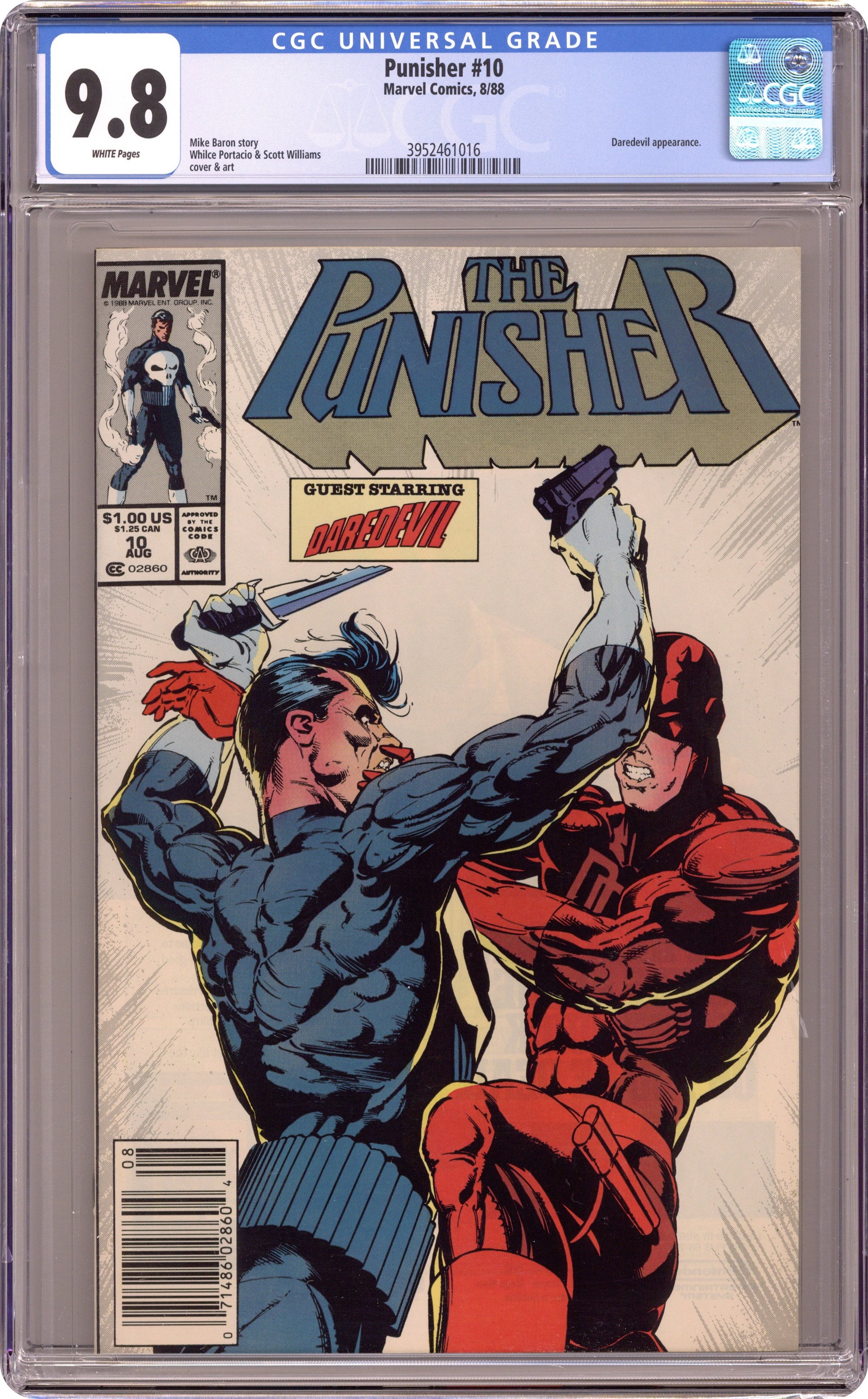Direct Edition. Crossover with Daredevil (1964-1998 1st Series) #257. Story by Mike Baron. Art by Whilce Portacio. Daredevil and the Punisher are like fire and ice. They just don't play well together. A known criminal is on the loose and Daredevil wants him to stand trial for his crimes but Frank intends to see that he never makes it to court. Sit back and enjoy a Daredevil/Punisher brawl the likes of which you've never seen before. It's a story told from two points of view. This is the Punisher's point of view. Read Daredevil #257 for 'ole Hornhead's. 32 pages. Cover price $1.00. Grade: CGC 9.8 explanation of grade Condition: Used (collectible)