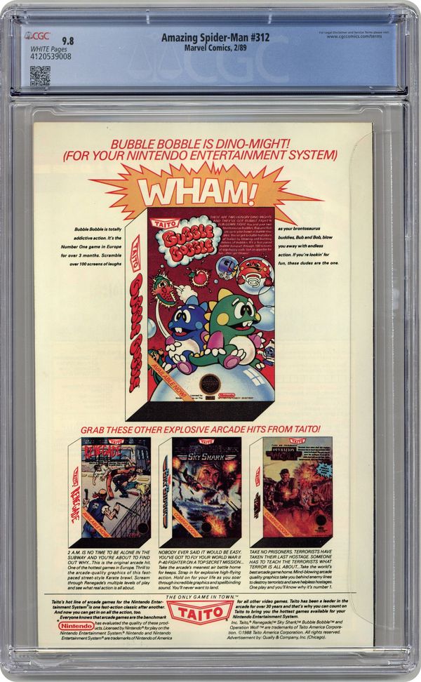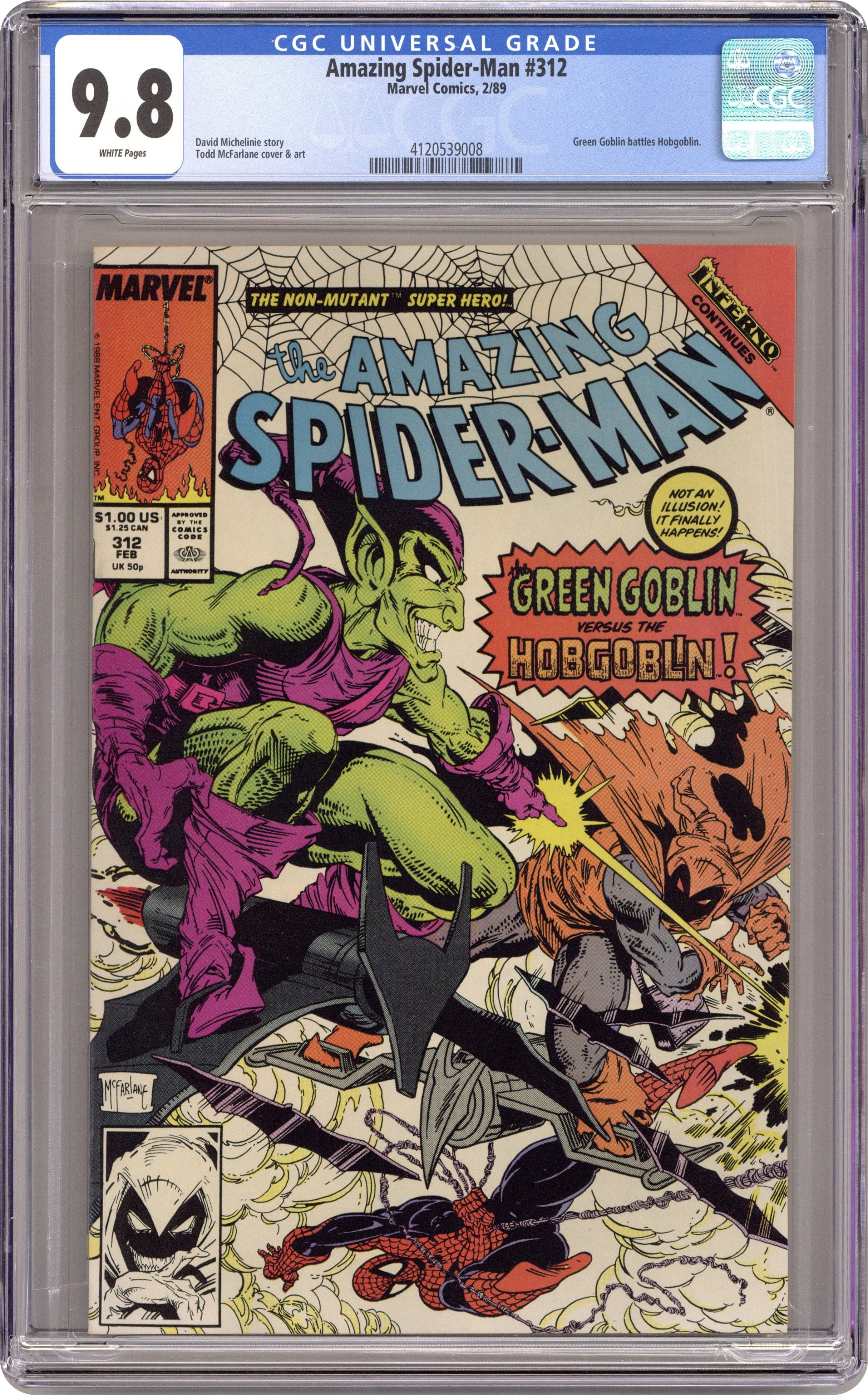 Direct Edition. "The Goblin War!" Inferno crossover. Script by David Michelinie. Art by Todd McFarlane. Cover by Todd McFarlane. Story continues from Web of Spider-Man 47. With his family in danger, the Green Goblin rides again! Oh my, does Harry know what he's doing by challenging the might of the Hobgoblin? In the skies above the Osborn Chemical Company, the pumpkin bombs fly as the goblins clash! And naturally your friendly neighborhood Spider-Man is caught in the middle! Meanwhile the effects of Inferno begin affecting Dr. Curt Connors. Uh-oh, could an appearance from the Lethal Lizard be in the near future? Yesss! Story continues in Spectacular Spider-Man 147. Cameo appearances by Mary Jane Watson, Liz Osborn, and J. Jonah Jameson. (Note: Harry Osborn dons the garb of the Green Goblin for the first time since Amazing Spider-Man 180.) 36 pgs. Cover price $1.00. Grade: CGC 9.8 explanation of grade Condition: Used (collectible)