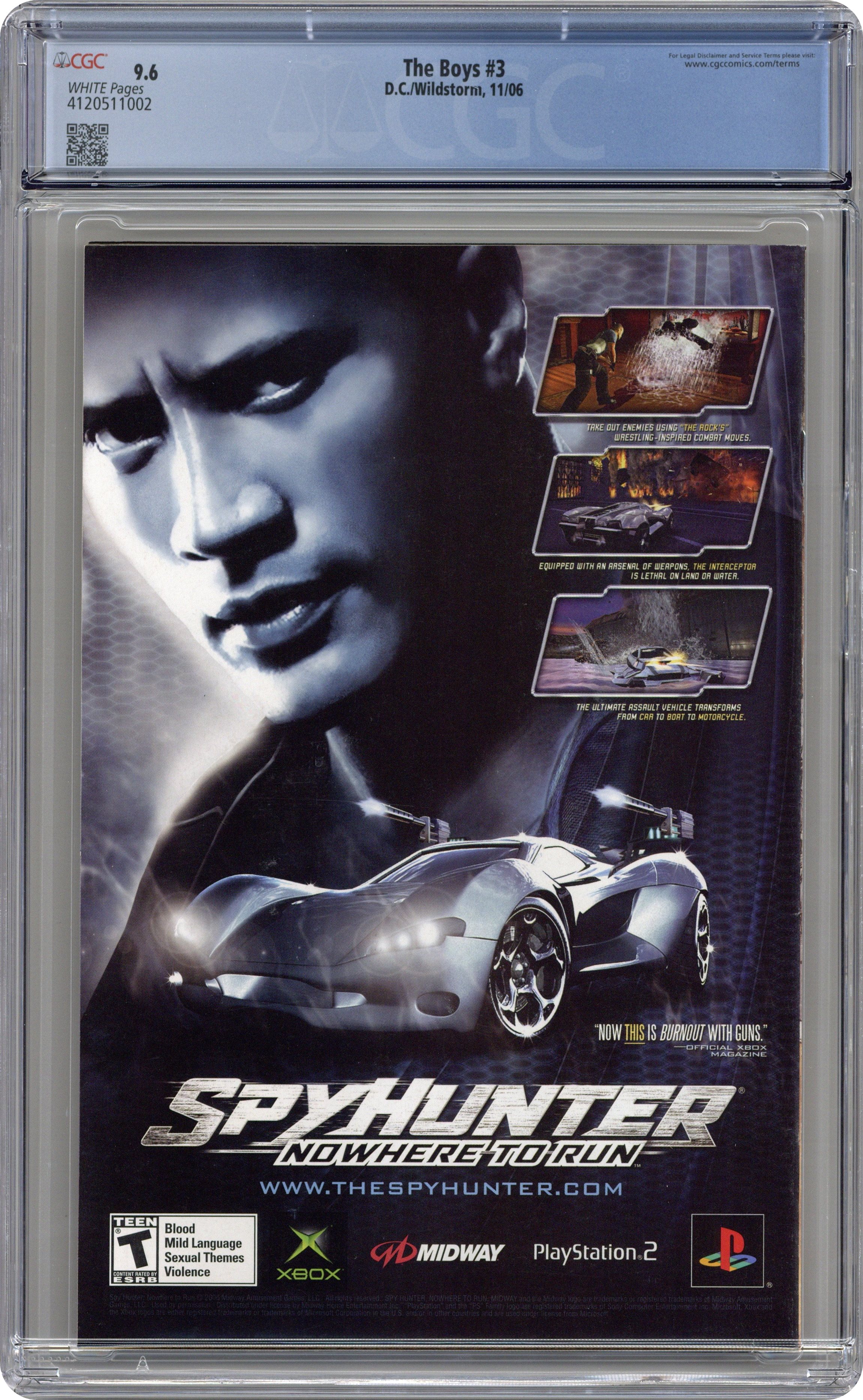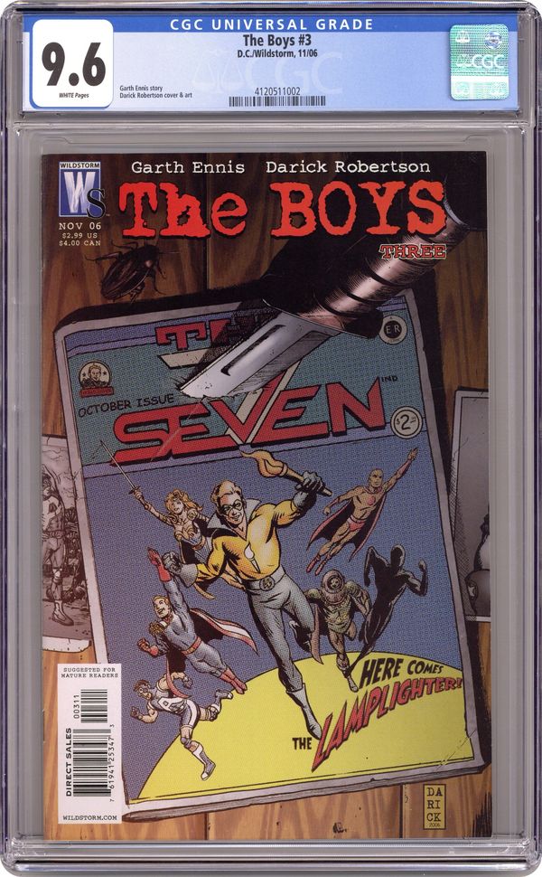 Written by Garth Ennis. Art and cover by Darick Robertson. The dark new series by Garth Ennis and Darick Robertson heats up as Wee Hughie gets his first taste of action with the Boys when Butcher throws him into the deep end. Meanwhile, meet the planet's mightiest heroes, The Seven, and the young superheroine who would join them. ? 32 pg, FC, ? MATURE READERS Cover price $2.99. Grade: CGC 9.6 explanation of grade Condition: Used (collectible)