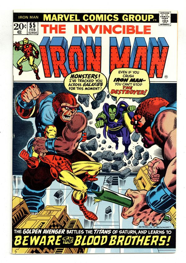 "Beware the Blood Brothers!" First appearance of Thanos. Story by Jim Starlin. Art by Jim Starlin and Mike Esposito. Cover by Jim Starlin and Joe Sinnott. One of the landmark Marvel issues of the Bronze Age. Drax the Destroyer is a prisoner of Thanos at the evil Titan's Earth-fortress. In an effort to escape, Drax telepathically reaches out to Tony Stark for assistance; but before Iron Man can come to the rescue, Shell-Head is ambushed by the Blood Brothers! Can Drax and the golden avenger defeat the Blood Brothers and Thanos? Also first appearances of Drax the Destroyer, Starfox (in a flashback), and Mentor. (Note: Iron Man 55 was reprinted as a Marvel Milestone Edition in 1992.) 36 pages Cover price $0.20. Grade: FN/VF 7.0 explanation of grade Condition: Used (collectible)