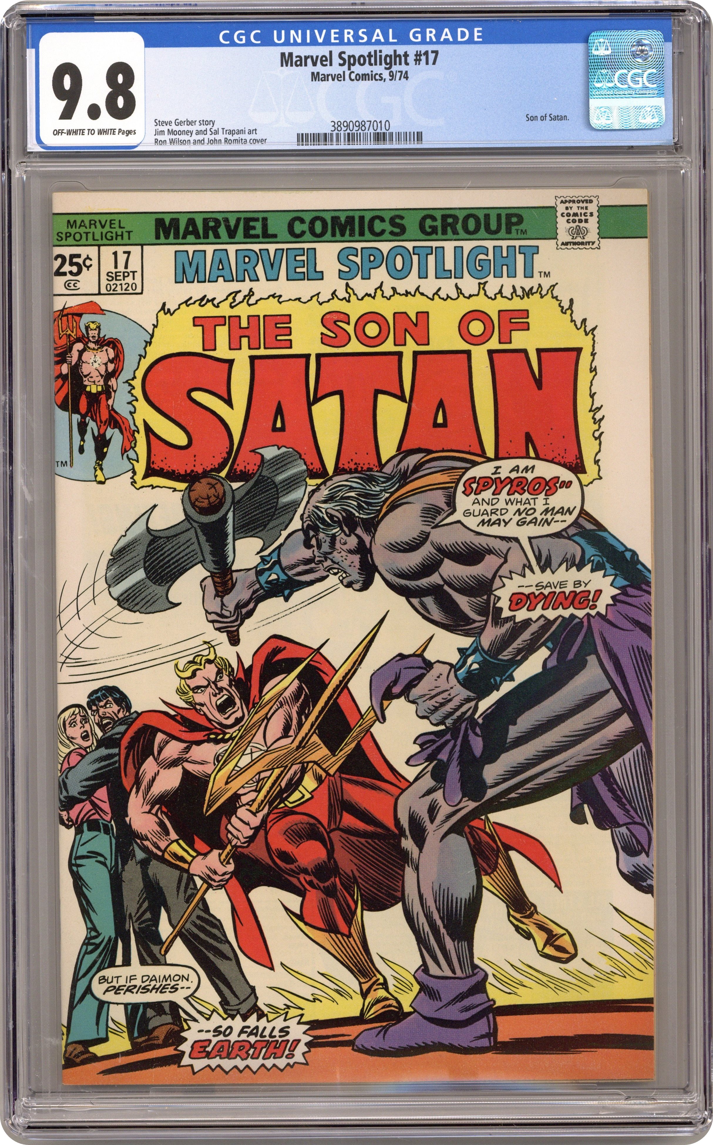 Cover inks by John Romita. In the Shadow of the Serpent!, script by Steve Gerber, pencils by Jim Mooney, inks by Sal Trapani; the fire-creature Kometes threatens to destroy Earth in the modern era while Son of Satan, Katherine Reynolds and Byron Hyatt are 20,000 years in the past in Pre-Cataclysm Atlantis trying to figure out a way to stop the creature; Daimon battle Spyros. The letters page contains Marvel Value Stamp series A # 45 (Mantis). 36 pages, full color. Cover price $0.25. Grade: CGC 9.8 explanation of grade Condition: Used (collectible)