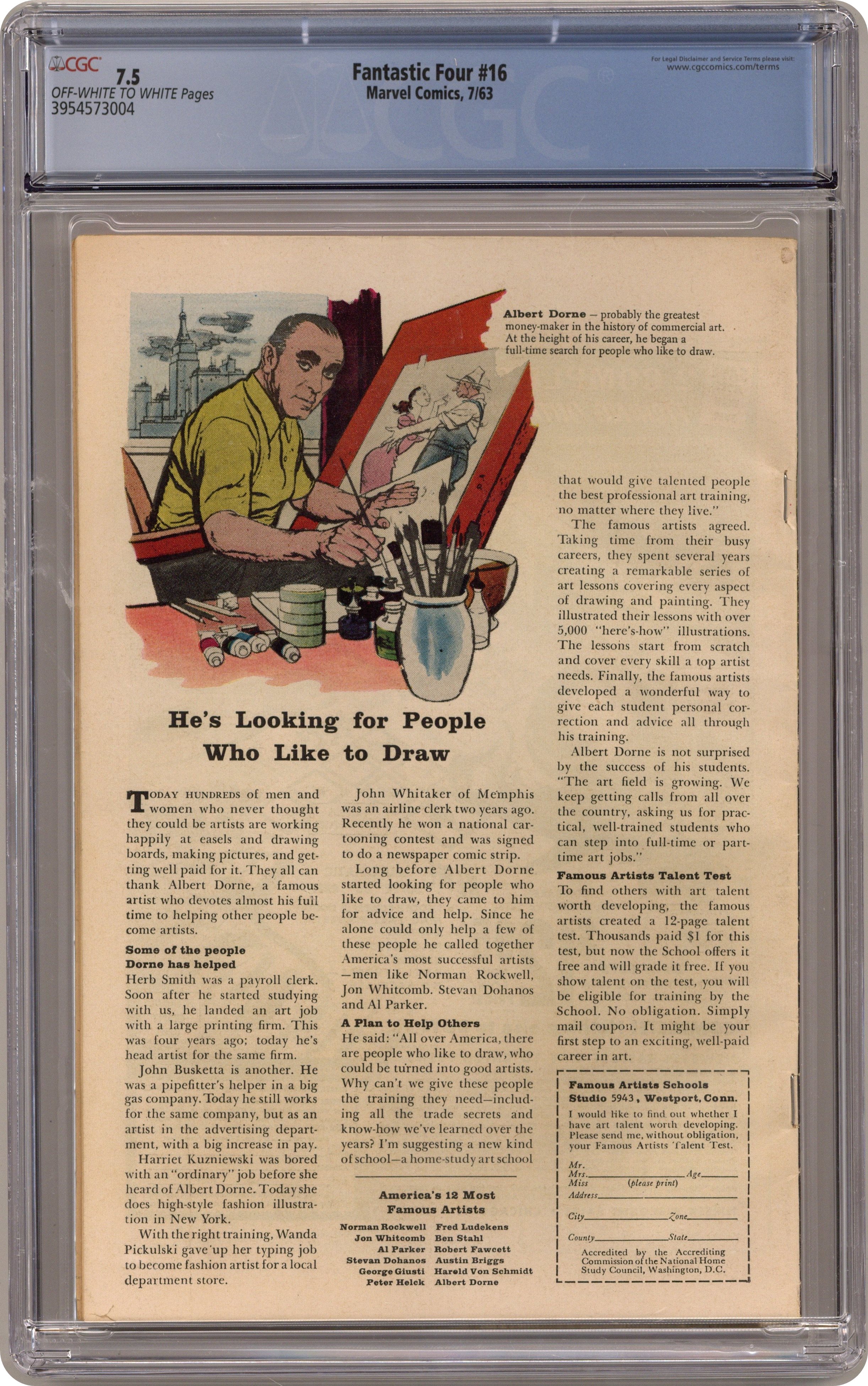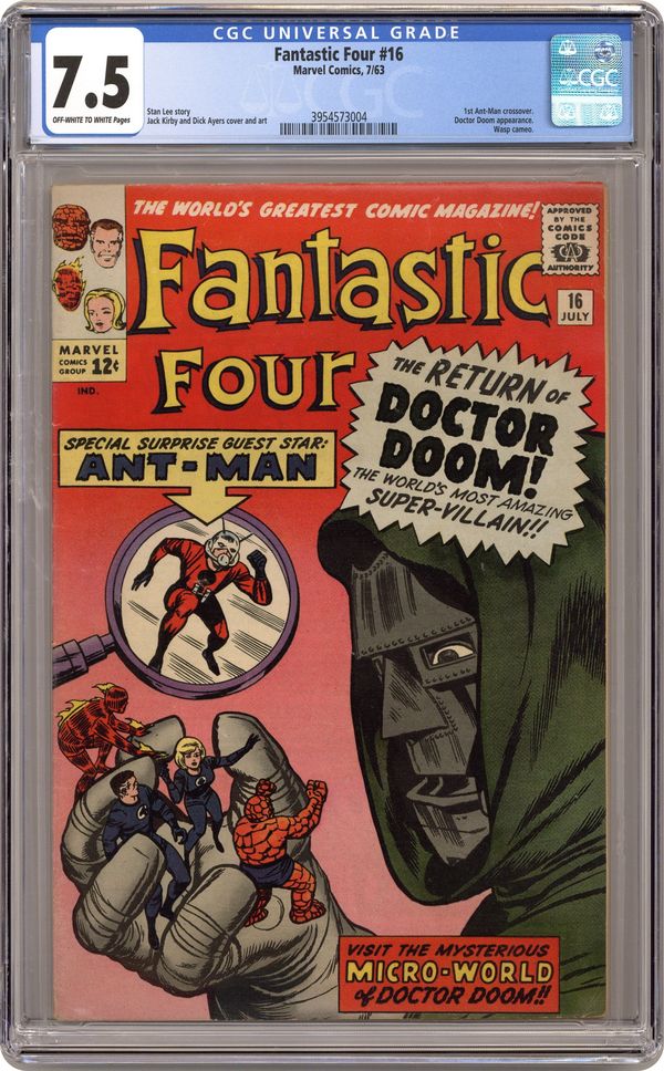 Cover pencils by Jack Kirby, inks by Dick Ayers. The Micro-World of Doctor Doom!, script by Stan Lee, pencils by Jack Kirby, inks by Dick Ayers; The Fantastic Four answers a cry for help from someone too small to be seen. They arrive in a micro-world whose leader is Doctor Doom. Page explaining Reed Richards powers. 36 pgs. $0.12. Cover price $0.12. Grade: CGC 7.5 explanation of grade Condition: Used (collectible)