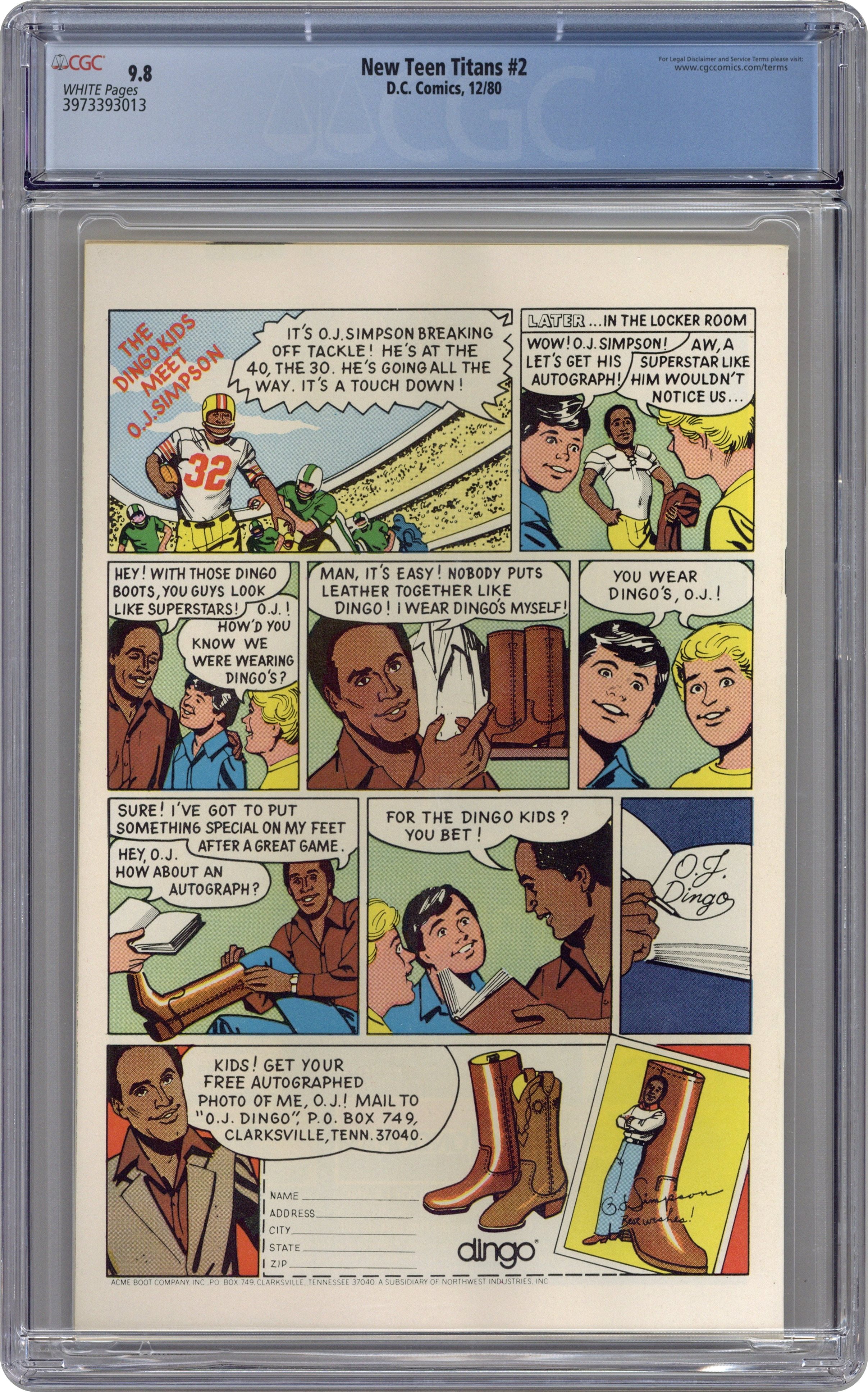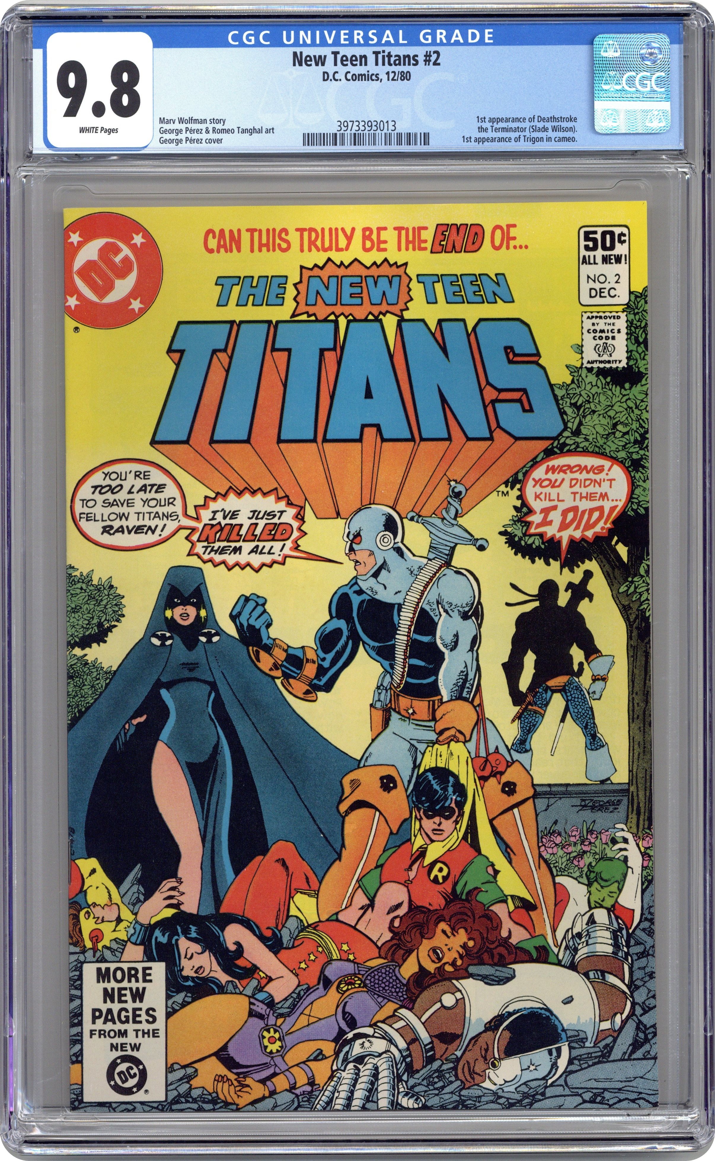 Direct Edition. First appearance of Deathstroke the Terminator in "Today...the Terminator!" Characters: Teen Titans [Robin; Kid Flash; Wonder Girl; Cyborg; Starfire; Raven; Changeling]; The Terminator [Slade Wilson] (1st; Later Deathstroke); The Ravager [Grant Wilson] (Intro; Death); Wintergreen (Intro); HIVE. Script by Marv Wolfman, with art by George Perez and Romeo Tanghal. Plus: an article by Marv Wolfman on the revival of the Teen Titans. Cover by George Perez. Cover price $0.50. Grade: CGC 9.8 explanation of grade Condition: Used (collectible)
