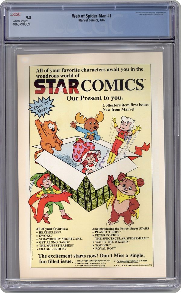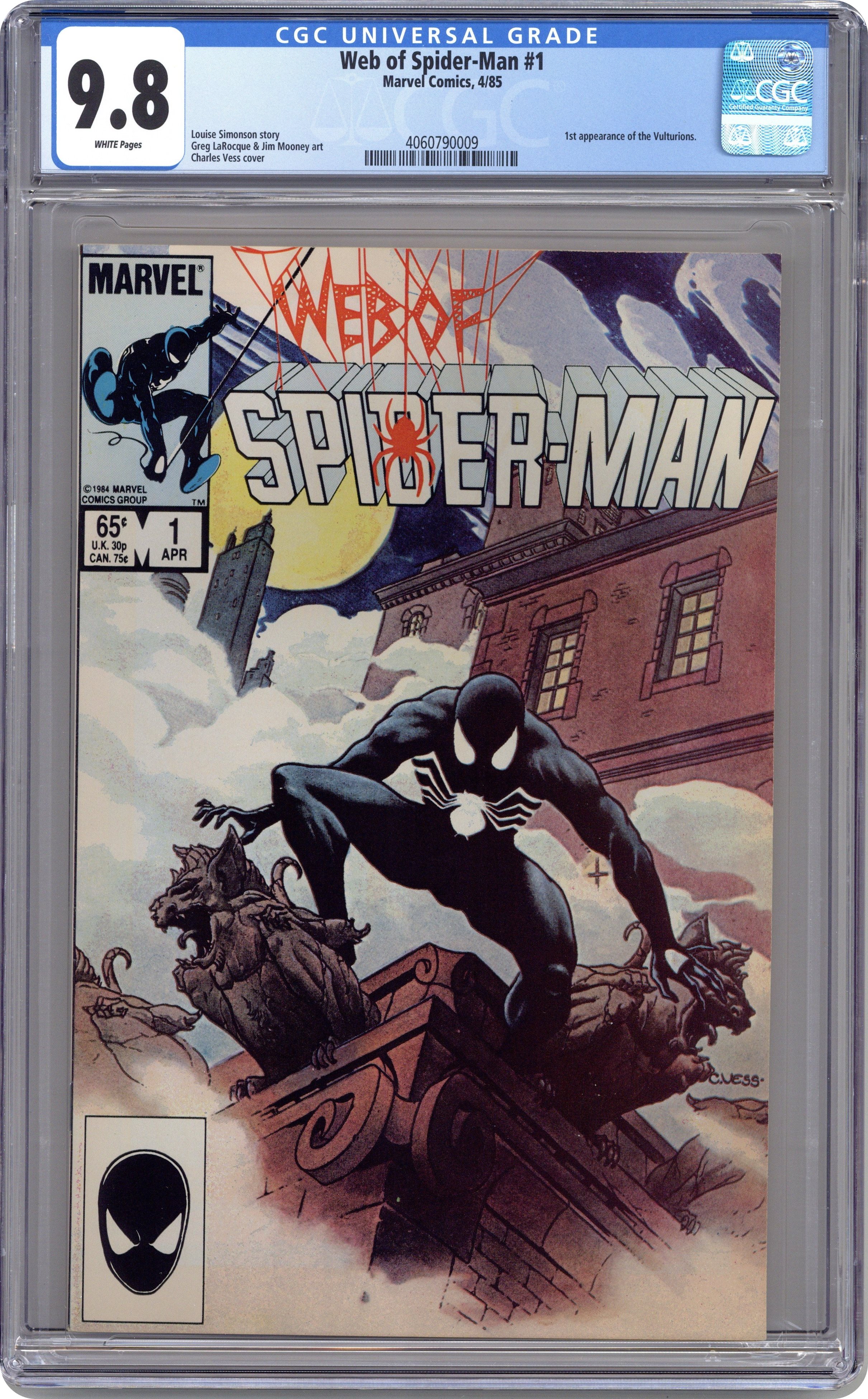 Direct Edition. "Til Death Do Us Part!" Story by Louise Simonson. Art by Greg LaRocque and Jim Mooney. Painted cover by Charles Vess. The alien symbiote (aka black costume) ambushes Peter Parker while he is getting dressed. Now Spider-Man must battle the black costume and the new Vulturions on his way to the Baxter Building! Meanwhile, Aunt May laments Peter's decision to drop out of graduate school. (Note: The Web of Spiderman series essentially replaced the Marvel Team-Up title as Marvel's third regular series featuring Spider-Man.) 32 pages Cover price $0.65. Grade: CGC 9.8 explanation of grade Condition: Used (collectible)