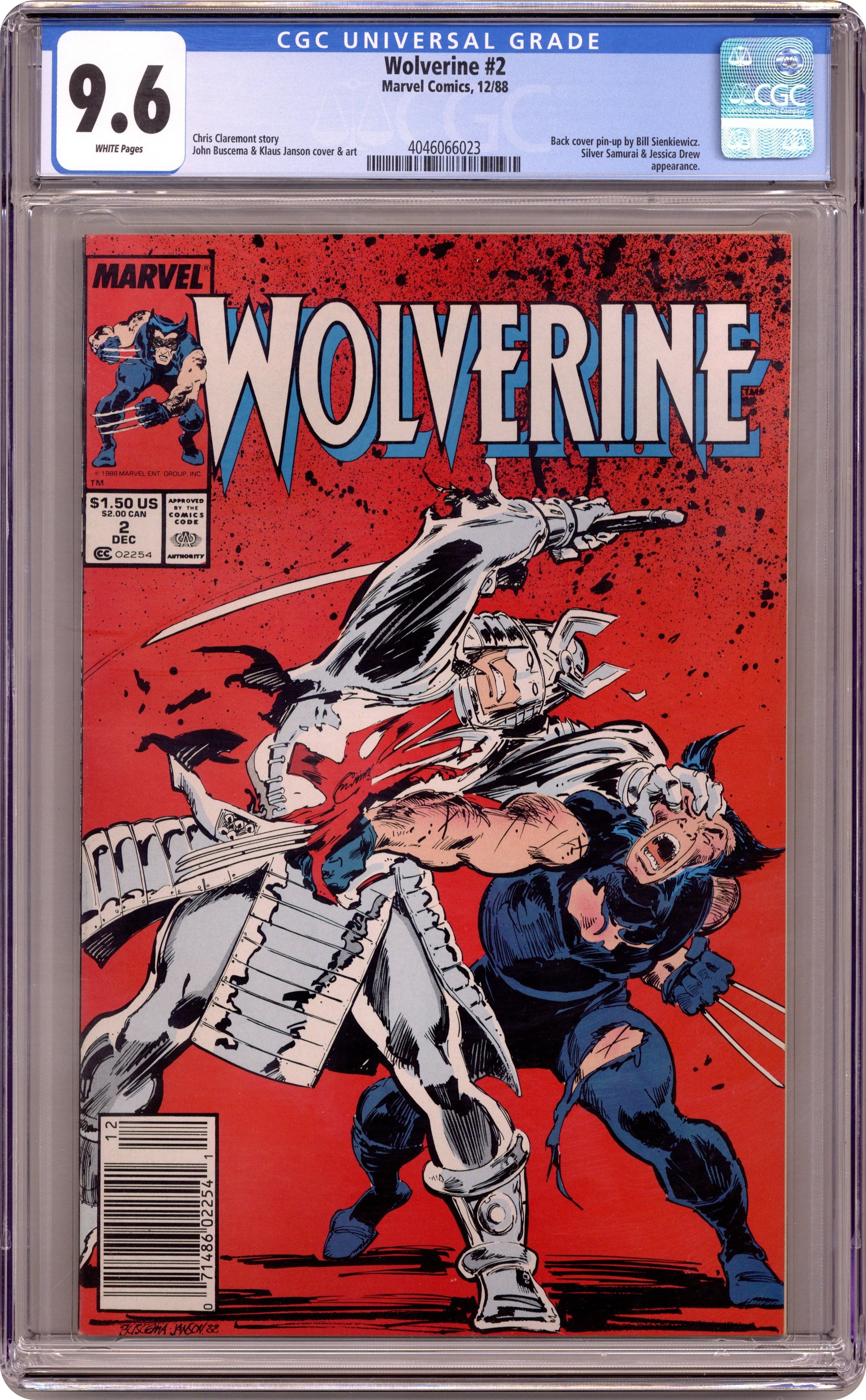 Direct Edition. Part 2 of 3 -"Possession is the Law!" Written by Chris Claremont. Art by John Buscema and Klause Janson. It seems everyone wants the Muramasa Sword, including Wolverine's old foe, the Silver Samurai. Bad thing is Jessica Drew (former and future Spider-Woman) controls the sword and is possessed by its dark power. Bill Sienkiewicz art on back cover. 32 pages, FC Cover price $1.50. Grade: CGC 9.6 explanation of grade Condition: Used (collectible)