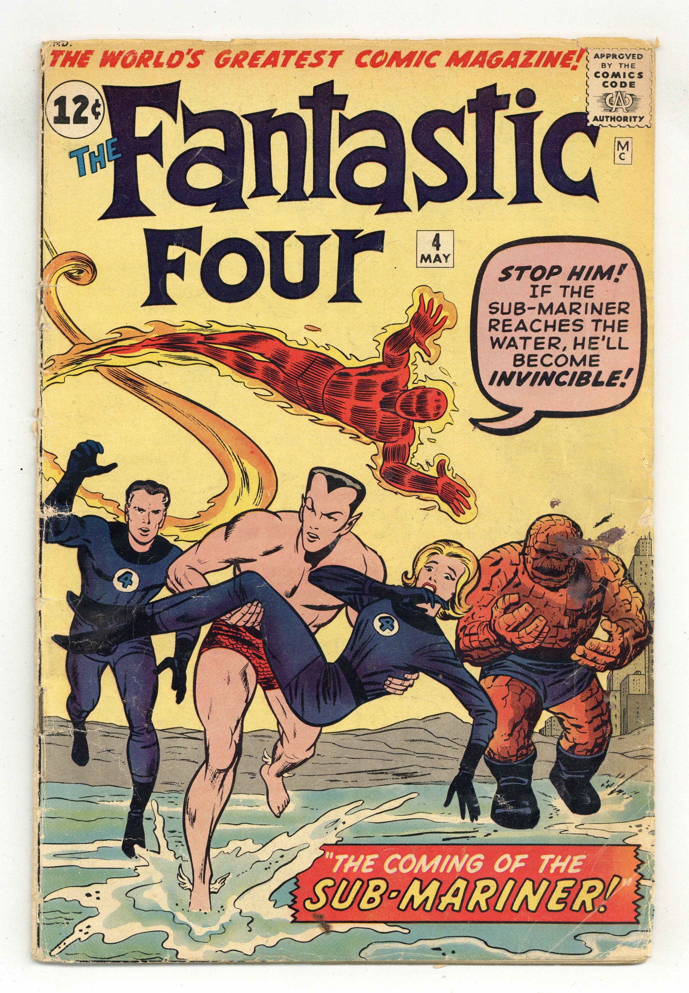Cover pencils by Jack Kirby, inks by Sol Brodsky. First Silver Age appearance of the Sub-Mariner in The Coming of... Sub-Mariner! Chapter 1 On the Trail of the Torch!, script by Stan Lee, pencils by Jack Kirby, inks by Sol Brodsky; The Fantastic Four is searching for the runaway Human Torch. Chapter 2 Enter the Sub-Mariner!; Fleeing the Thing, the runaway Human Torch finds the amnesiac Sub-Mariner. Chapter 3 Let the World Beware!; The Human Torch drops the Sub-Mariner into the sea and he regains his memory. Chapter 4 Sub-Mariner's Revenge!; The Sub-Mariner sends Giganto to smash New York. The Fantastic Four Pin-Up Page, pencils by Jack Kirby, inks by Sol Brodsky. Chapter 5 Return to the Deep! 36 pgs. $0.12. Cover price $0.12. Grade: PR 0.5 explanation of grade Condition: Used (collectible)