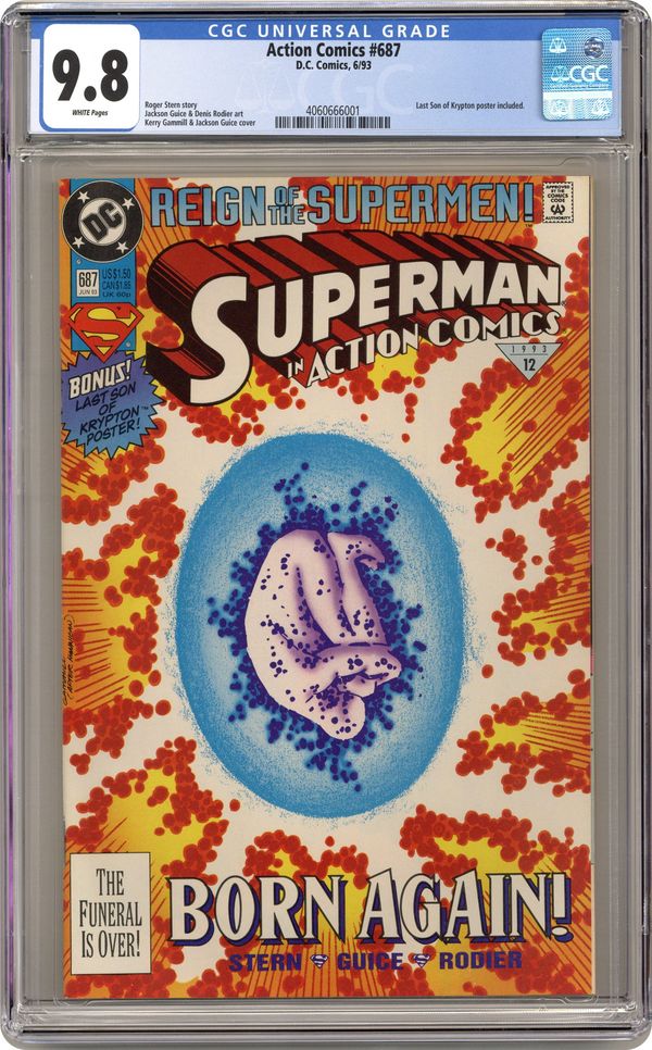 Cover by Kerry Gammill and Jackson Guice. Beginning the 'Reign of the Supermen,' continued from Adventures of Superman (1939) #500. The Last Son of Krypton returns to action, and this Superman has no qualms about taking a human life...so long as it's the right thing to do! Also, Pa Kent reacts to Superman's tougher techniques. Bound into the center of this issue is a double-page miniposter of Superman, printed on cover stock. Written by Roger Stern, with art by Jackson Guice and Denis Rodier. 40 pages, Full Color, $1.50. Cover price $1.50. Grade: CGC 9.8 explanation of grade Condition: Used (collectible)