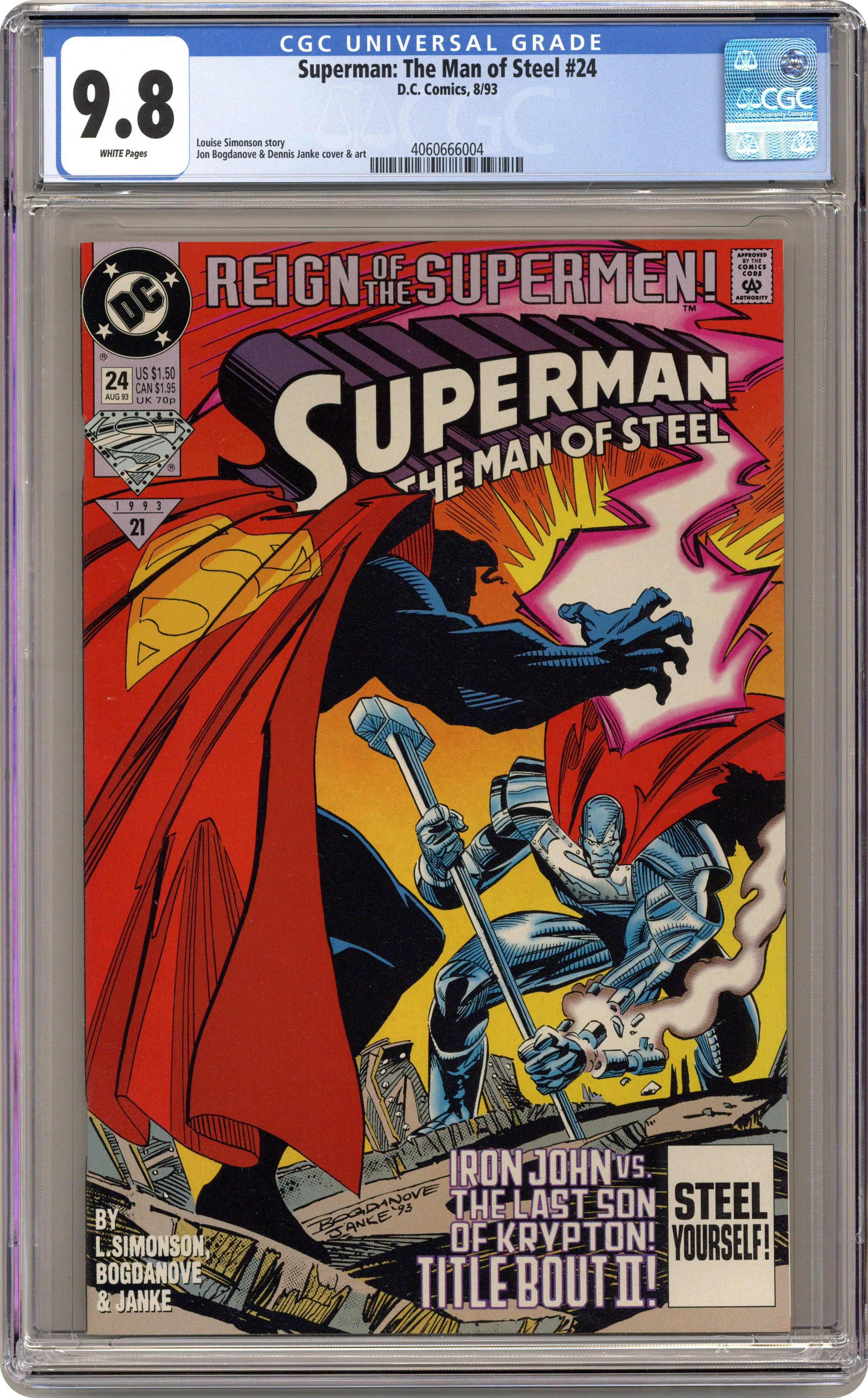 The 'Reign of the Supermen' continues from Action Comics (1938 DC) #689. The Man of Steel takes on the crimelord White Rabbit after confronting the cold, alien Superman (a.k.a. the Last Son of Krypton). Also, Green Lantern's Coast City is threatened, as the menace of Mongul looms near! Continues in Superman (1987) #80. Written by Louise Simonson, with art and cover by Jon Bogdanove and Dennis Janke. Cover price $1.50. Grade: CGC 9.8 explanation of grade Condition: Used (collectible)