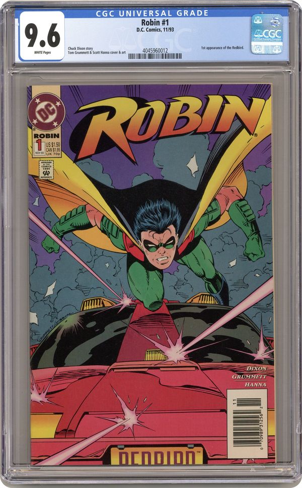 Newsstand edition 1st app of Robin's car, The Redbird; Azrael Batman app Cover price $1.50. Grade: CGC 9.6 explanation of grade Condition: Used (collectible)