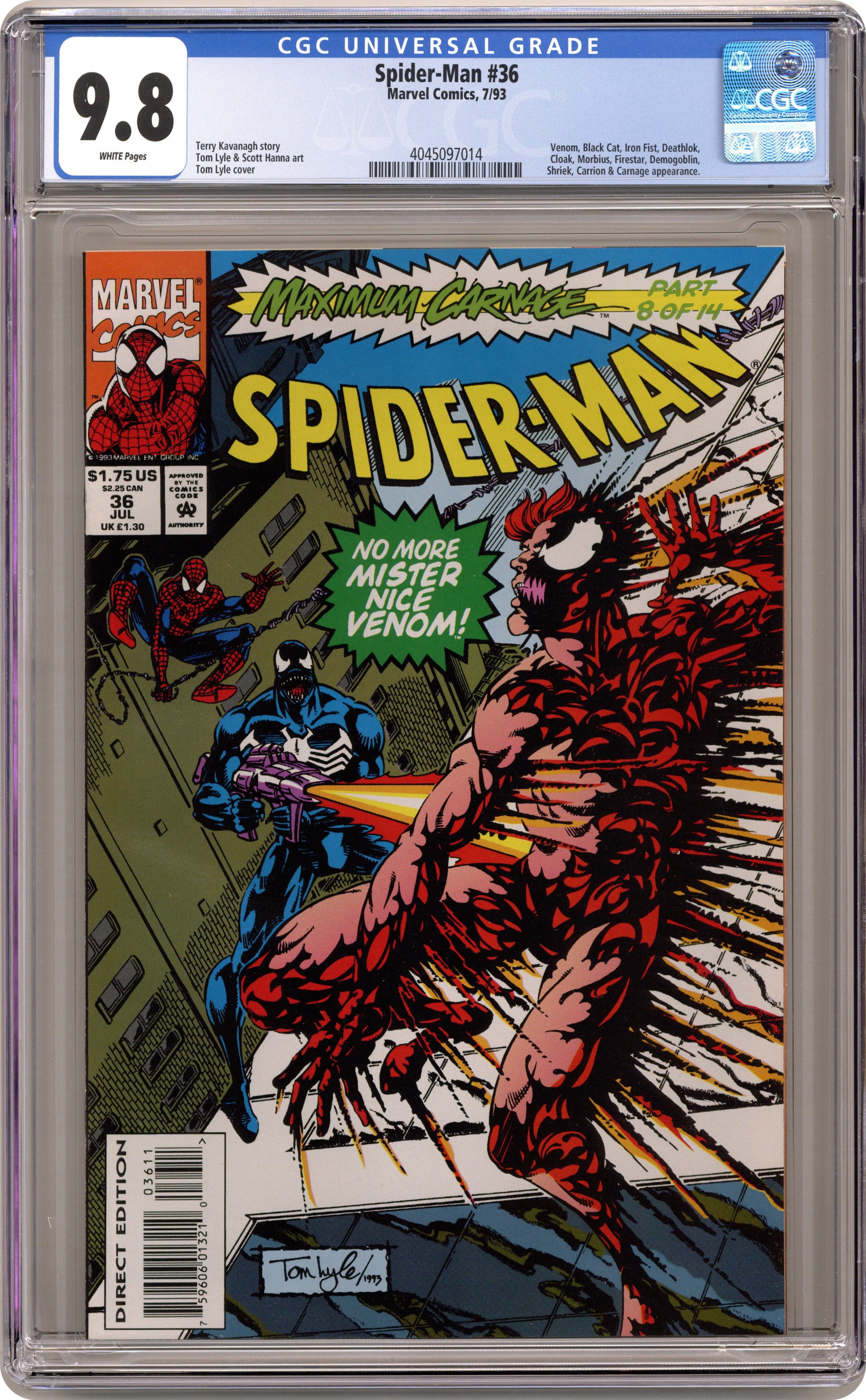 Direct Edition. Maximum Carnage Part 8 of 14. "Hate is in the Air" Guest-starring Cloak and Firestar. Script by Terry Kavanagh. Pencils by Tom Lyle. Inks by Scott Hanna. Cover by Tom Lyle. Story continues from Amazing Spider-Man 379. Spider-Man and Venom are still trying to defeat Carnage, so they turn to the Daily Bugle publisher for help. Jonah is reluctant to do anything for the web-slinger, but with a little persuasion (from the Lethal Protector), he runs a story about the orphanage where Cletus Kasady grew up. After seeing the headline, Carnage's crew visits the old Brooklyn orphanage -- and that sets the stage for the next great battle in the Maximum Carnage saga! The wall-crawler, Venom, Cloak, Firestar, and Black Cat vs. the Demogoblin, Carrion, Shriek, doppelganger, and Carnage! Will Reed Richards' sonic disruptor tilt the fight in the heroes' favor? Story continues in Spectacular Spider-Man 202. Cameo appearances by Deathlok, Iron Fist, Morbius, Aunt May, Richard Parker, Mary Parker, Flash Thompson, Liz Osborn, Normie Osborn, and the Molten Man. (Note: This 14-part story was reprinted in 1994 and again in 2004 in the trade paperback: Spider-Man Maximum Carnage.) 32 pages. Cover price $1.75. Grade: CGC 9.8 explanation of grade Condition: Used (collectible)