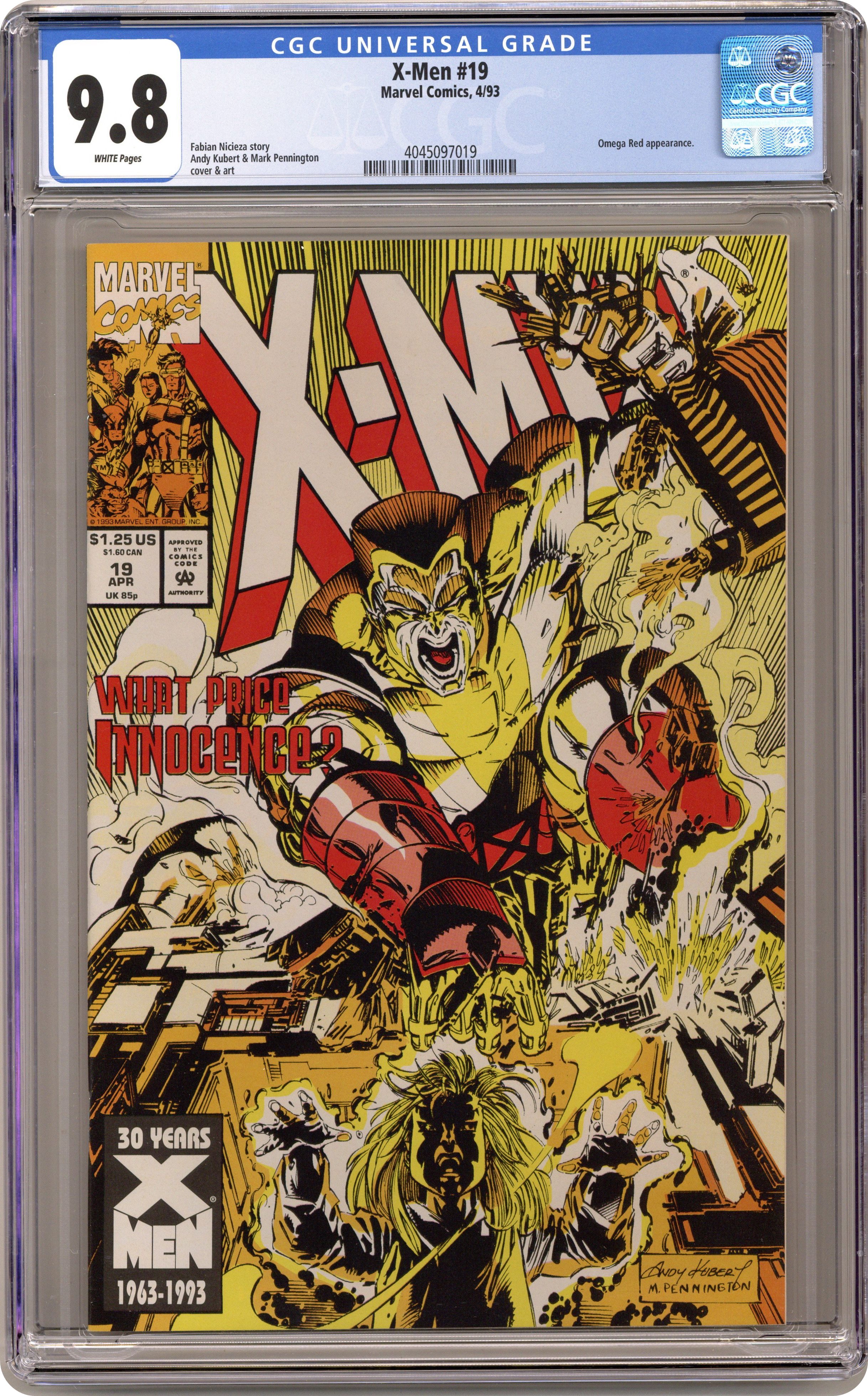 Cover pencils by Andy Kubert, inks by Mark Pennington. A Skinning of Souls Part Three: Harvest of the Innocent, script by Fabian Nicieza, pencils by Andy Kubert, inks by Mark Pennington (pp. 1-9), Bob Wiacek (pp. 10-11), Dan Panosian (pp. 12-16), and Al Williamson (pp. 17-22); The Russian government plans on using Illyana to stop the Soul Skinner but kills her parents to get to her; The X-Men stop the Skinner and save Illyana, but not before Colossus experiences even more loss. 36 pgs. $1.25. Cover price $1.25. Grade: CGC 9.8 explanation of grade Condition: Used (collectible)